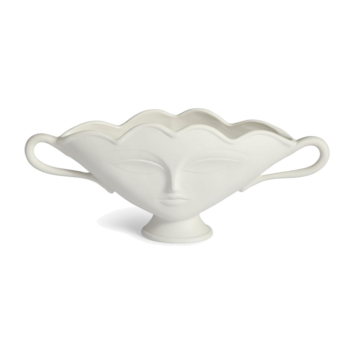 Take your tablescape from so-so to sublime. Made from white porcelain with a matte finish our spin on this traditional flower-friendly vessel features our muse Giuliette's ethereal face (on both front and back) and a lightly scalloped rim. This subtle show-stopper's shallow depth makes it a match for your mantelscape or console. Jonathan throws the models for the Muse vessels and then substitutes our signature geometric relief patterns with body parts—faces breasts lips—to create a surreal style. Each piece is inspired by our favourite artists' muses.