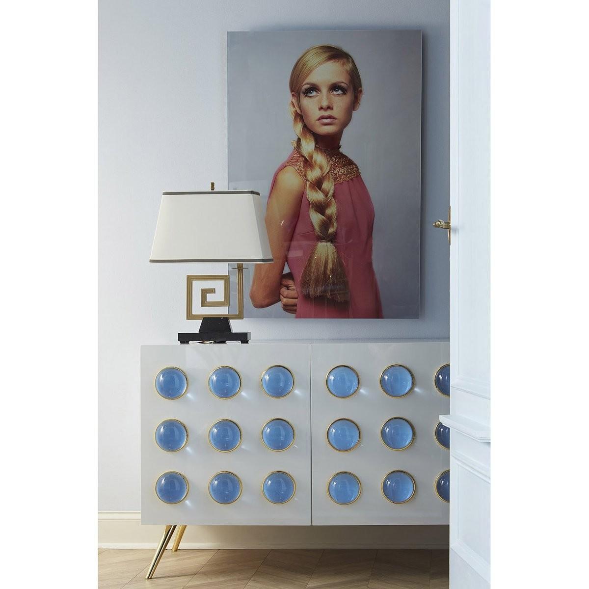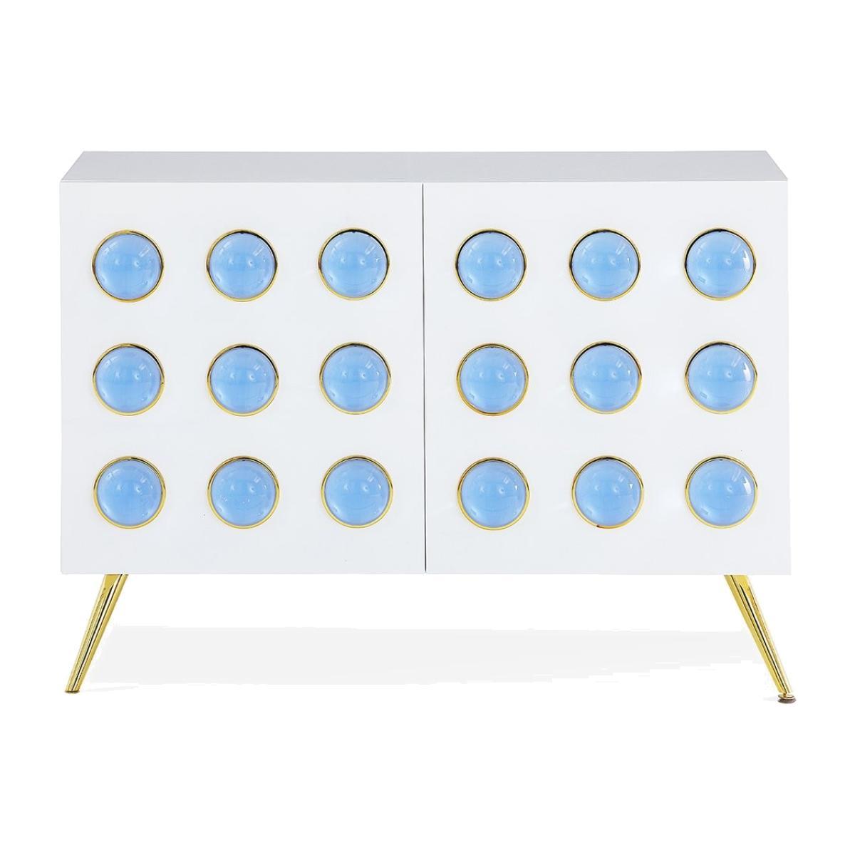 Futuristic Elegance. A glossy, white lacquer cabinet featuring two front doors capped with blue solid acrylic cabochons. Tapered brass legs give it an elegant edge. Guaranteed to deliver mega glamour while you stash your stuff.