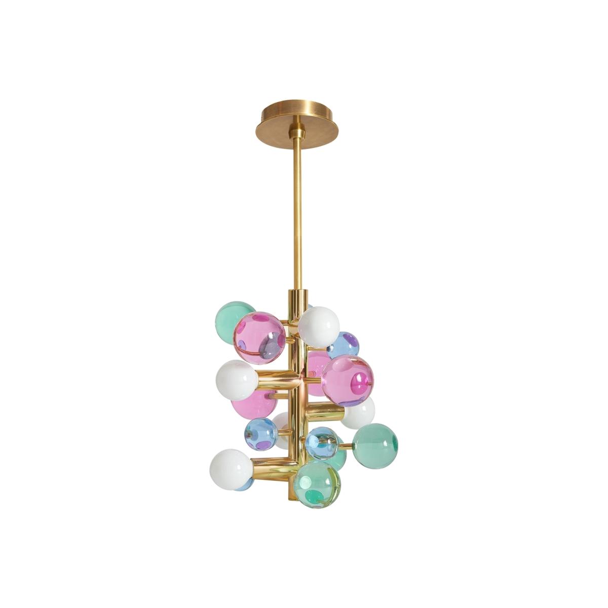 Lustrous Sculpture. A constellation of acrylic spheres floats on a brass stem with five interspersed globe bulbs to create a glamorous rhythm of light. Diminutive in scale but big in style think of our Globo Five-Light Chandelier as jewellery for your ceiling. A little industrial a little fancy a lot versatile. Perfect in a posh powder room or a fierce foyer.