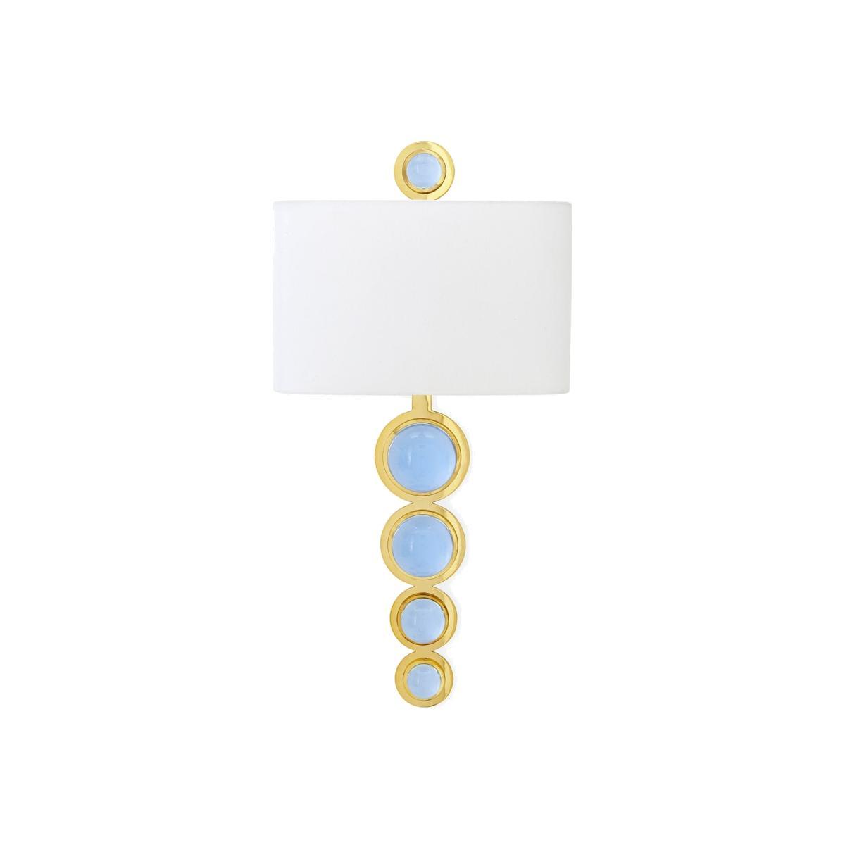 Futuristic Fantasy. A precious jewel for your wall, our Globo Sconce features a line of luminous blue acrylic spheres set in polished brass frame and topped with a white shade. Perfect in a posh powder room or fabulous foyer, these beauties are also ultra-elegant flanking a bed.
