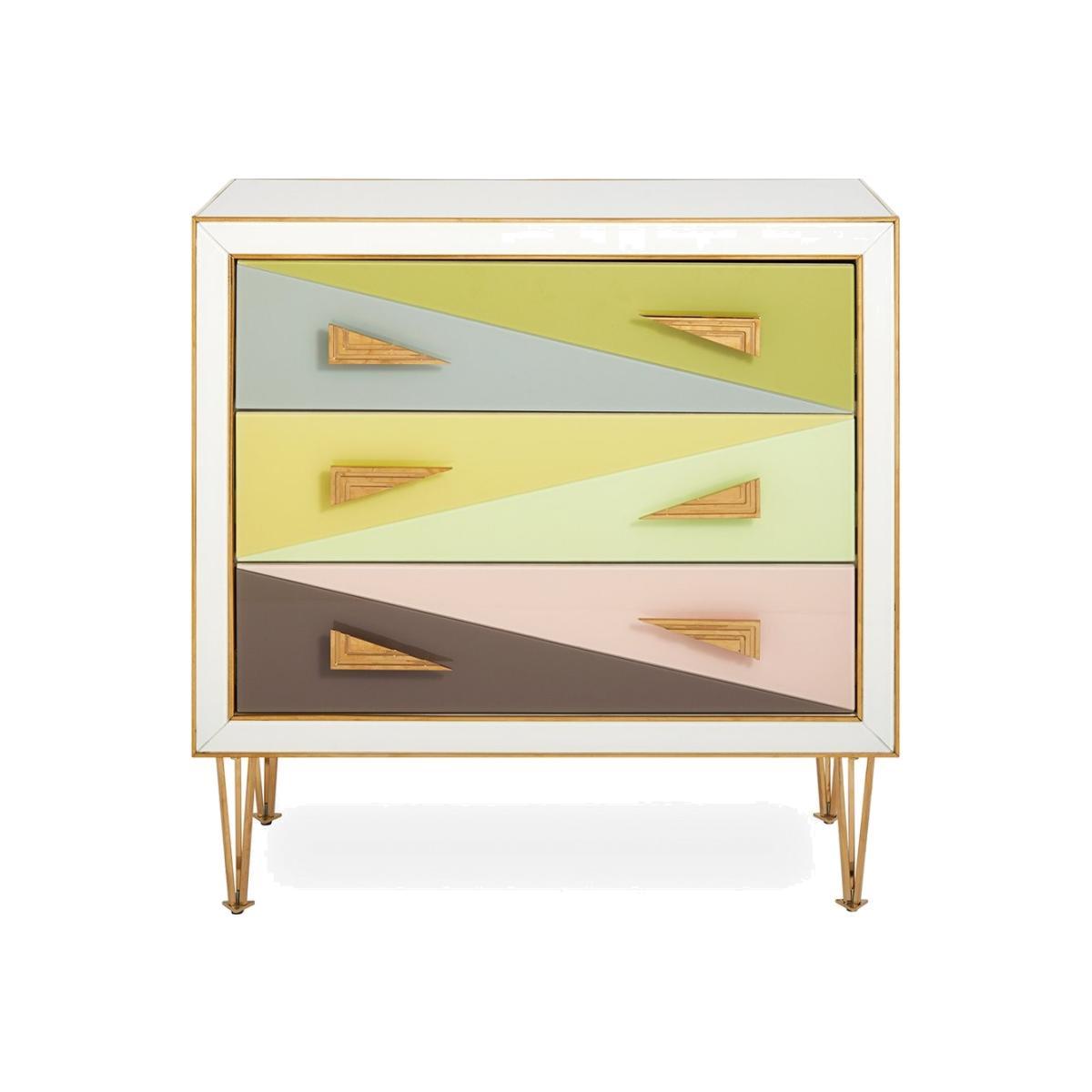 Avant Wow. A little Italian Modern, a lot of irresistible colour. Our Harlequin Three-Drawer Chest features back-painted glass panes in angular forms in muted, sunrise-inspired hues or bold and brilliant blues. The ivory case is tipped with brass edging, adorned with super-modern grooved hardware, and perched on our futuristic interpretation of a hairpin leg. Give your dressing room a graphic pop, or add an avant accent to a neutral boudoir.