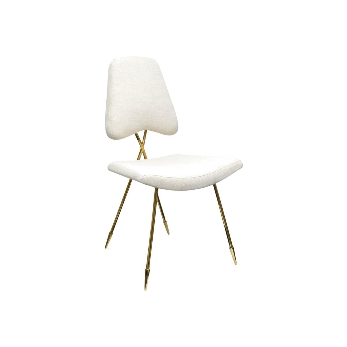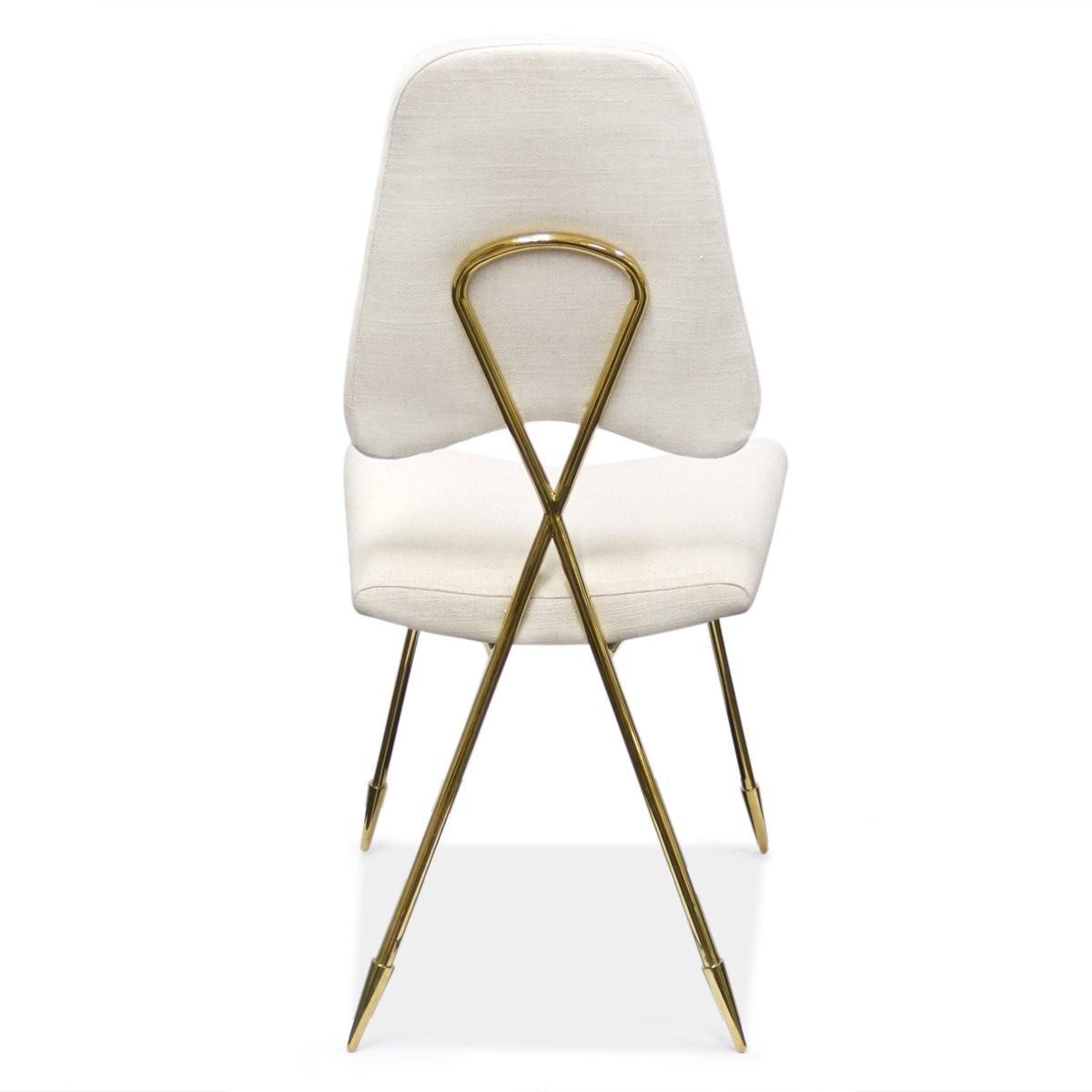 Modern Elegance. A gleaming brass frame with an intriguing crisscross back and our signature sabots cradles a softly curved seat and sculptural back. But don't be fooled by the sinuous frame—the Maxime Dining Chair is trés comfy. In fresh and neutral Belgium Stone linen, it's light and airy but with powerful presence. Also available in moody charcoal or bold burnt orange velvet for glamorous effect.