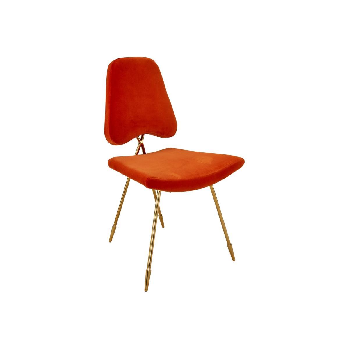 This chair is a fantastic choice for adding a pop of colour and a contemporary feel to dining spaces or even home offices. I love its bold persimmon hue, which works particularly well in neutral or minimalist interiors to create a statement. Its sleek silhouette and brass accents make it versatile enough to pair with both modern and eclectic decor schemes. For styling tips, try balancing the colour with soft, muted tableware or upholstery in complementary tones. It also works well if grouped with other chairs in contrasting colours or textures for a dynamic dining setup. Practical and stylish, this piece is perfect for anyone looking to inject personality into their interior without sacrificing comfort.