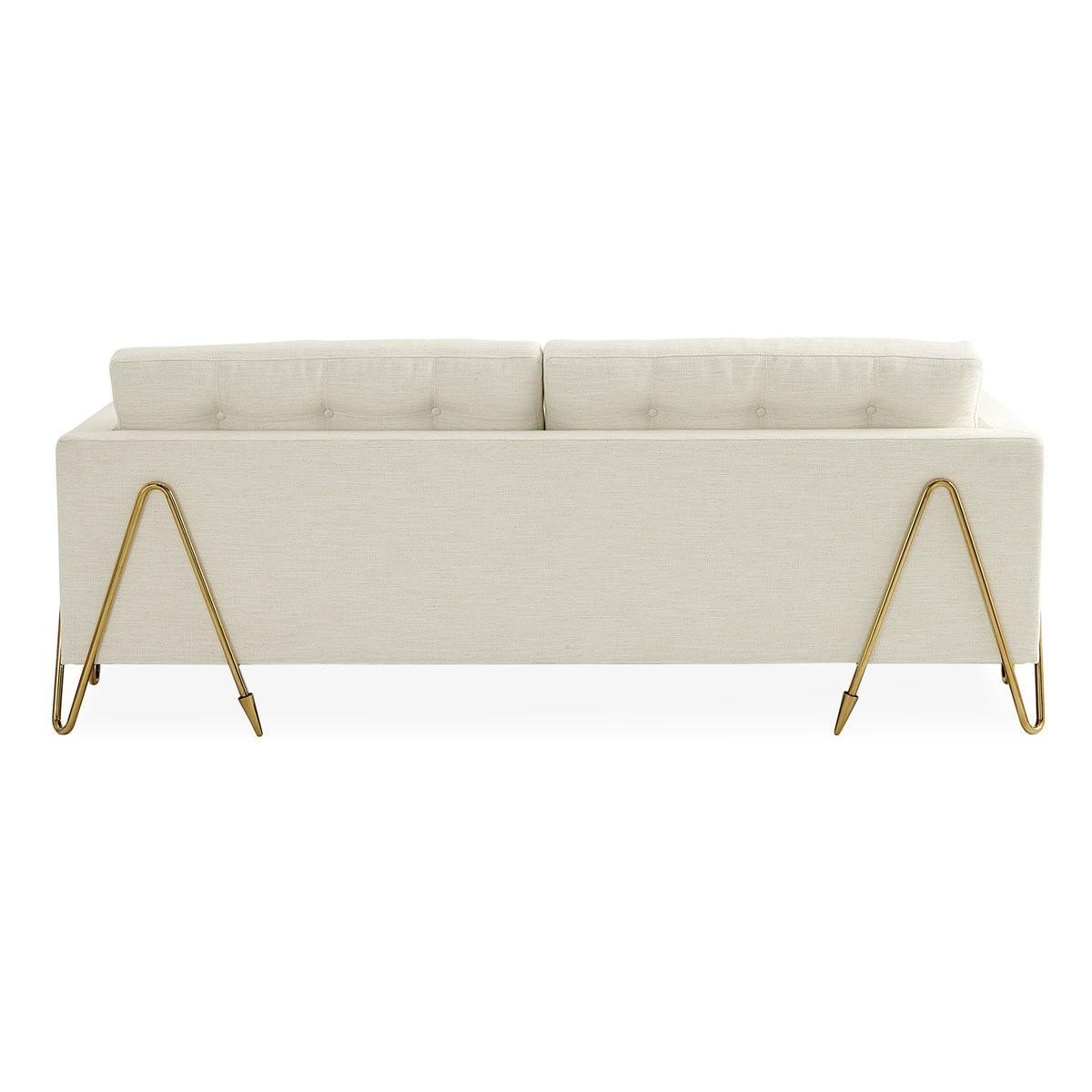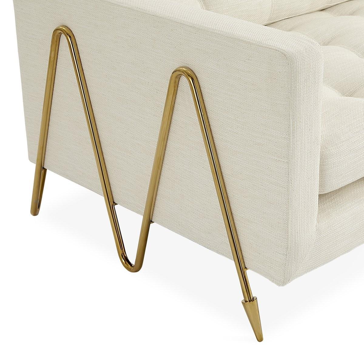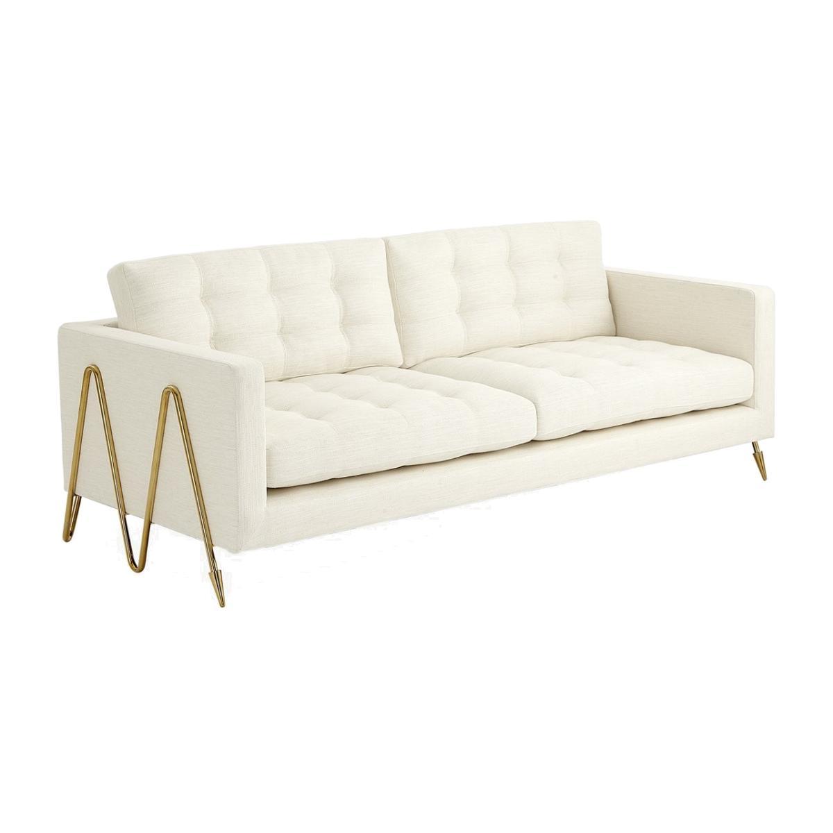 Modern Elegance. A hard-working sofa with an haute couture finish. Our Maxime Sofa features a mid-century-inspired silhouette cradled by an undulating brass frame featuring our signature arrow sabots. Upholstered in Lucerne Oyster bouclé and marked by its reversible topstitched cushions—buttons on one side and pull tufts on the reverse to let you tailor the tailoring. This profile is the stuff design magazine dreams are made of—float it in the centre of the room to show off your bold bona fides.