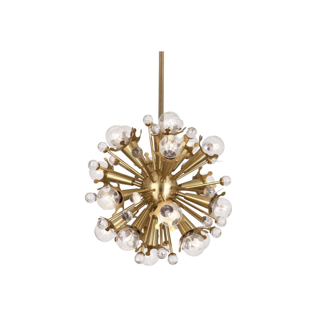 Modern Glamour. A groovy classic with our own twinkly twist. The Mini Sputnik Chandelier is perfect for adding some space-age elegance to your powder room or fab as a cluster at different heights over your cocktail table. Our riff on the design staple features custom laser-cut crown cups that halo the bulbs to create a modern glow. Tiny stems with crystal accents further reflect the galactic light and lend a ladylike grace to any room.