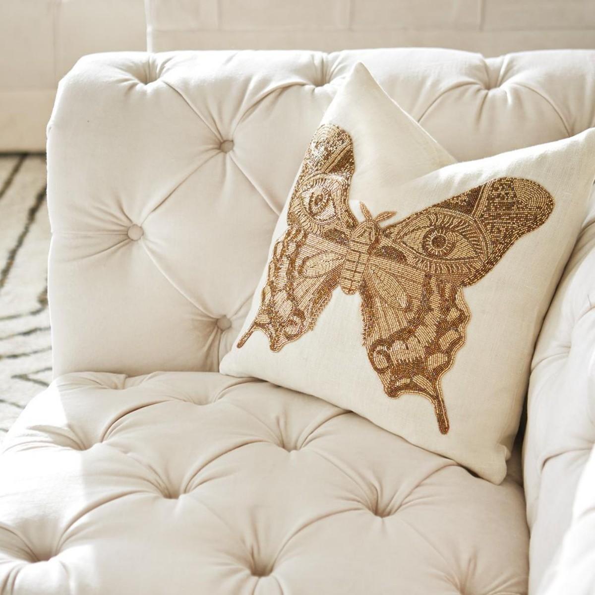 Handcrafted intricate gold beadwork embroidered on chunky ivory linen, our Muse Pillows are the perfect mix of the decadence of Halston and the madness of Dali. Crafty, couture, and exotic, these pillows will remind your guests they're in the presence of an eccentric glamour-puss.