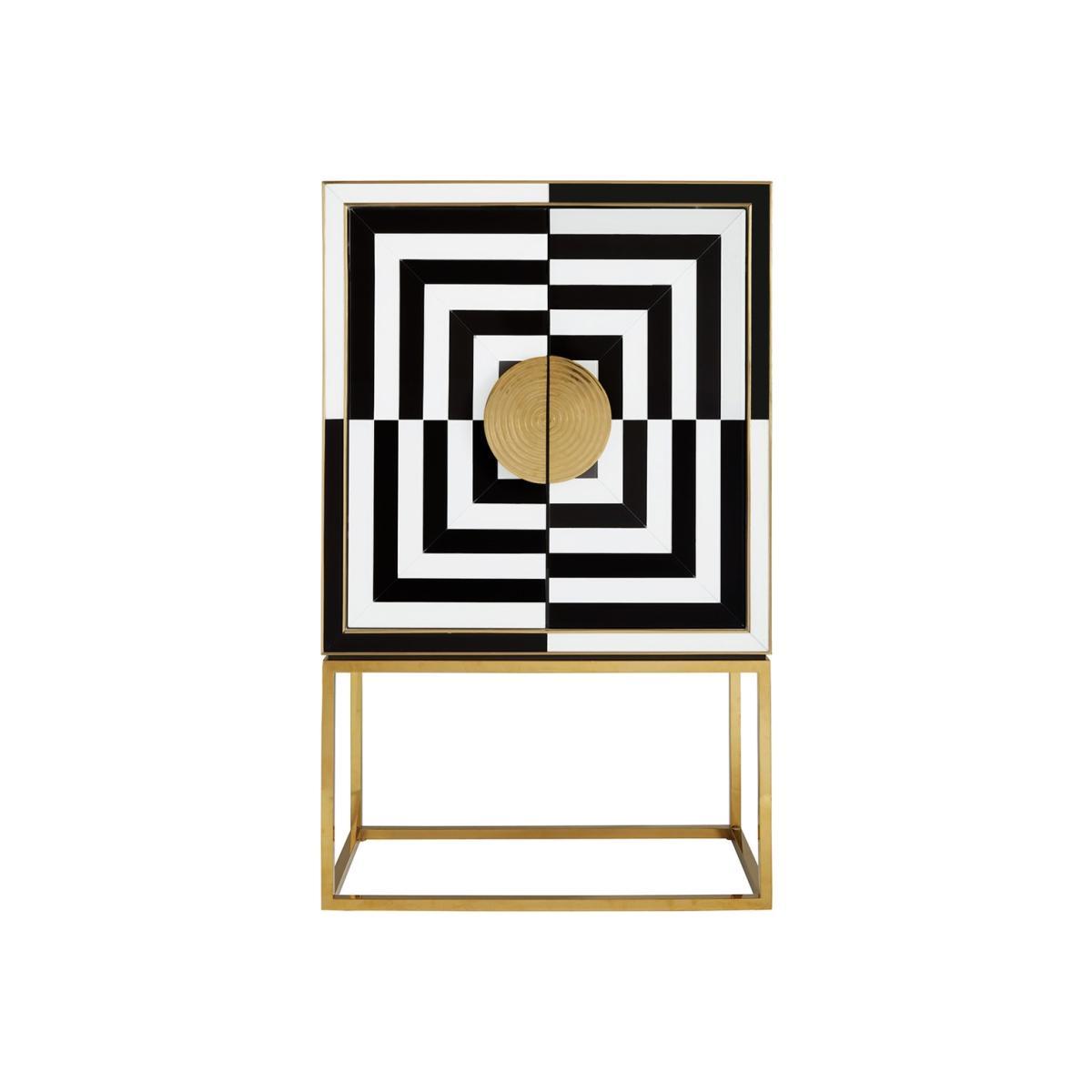 POP Art. Our modernist and mind-bending cabinet features glass panes reverse-painted in charcoal and ivory with polished brass details. Grooved, split-circle door pulls add a glam spin. Fitted with adjustable tempered glass shelves, plus six wire-bound drinking glass shelves inside the doors. Two drawers at the base keep your mixing accoutrements at hand.