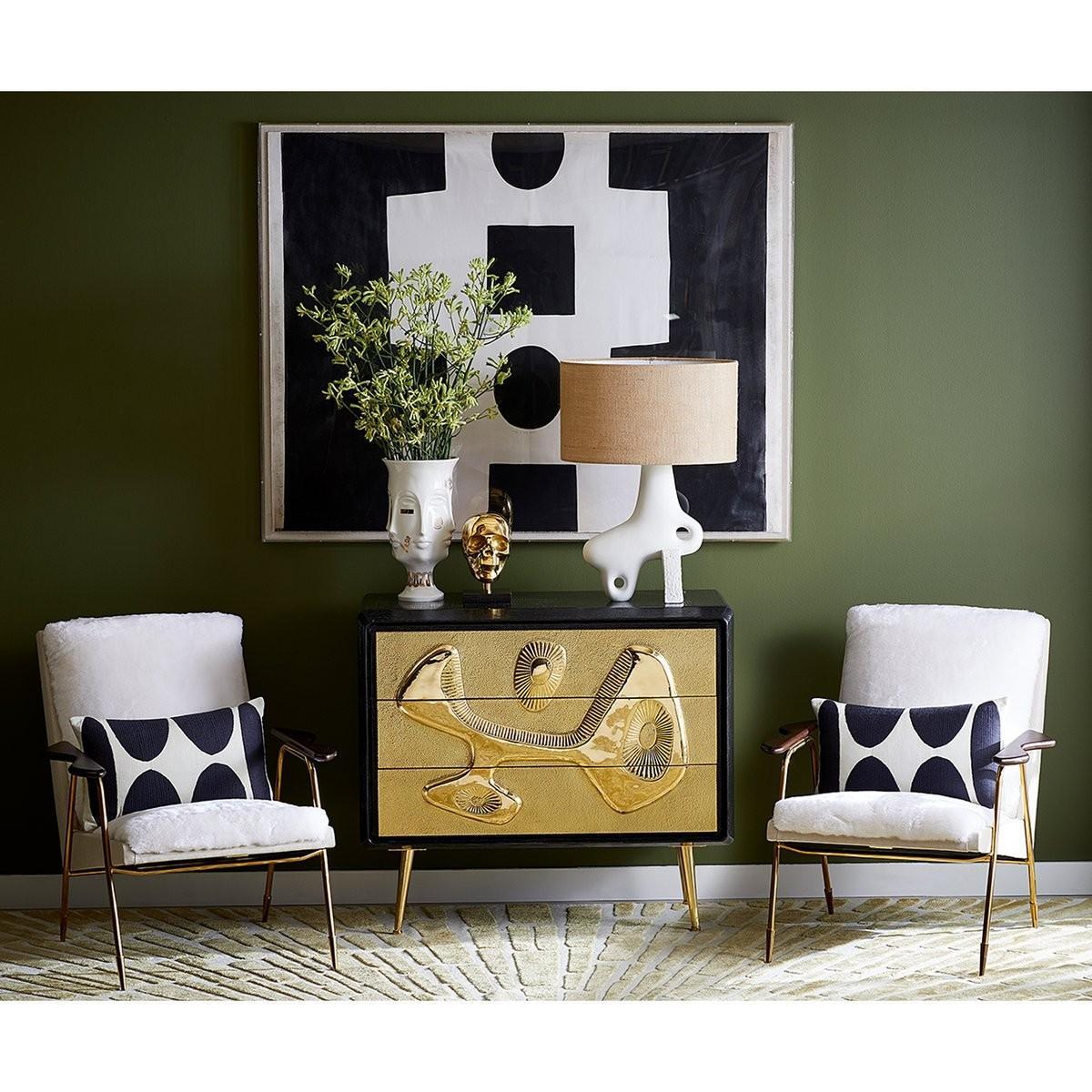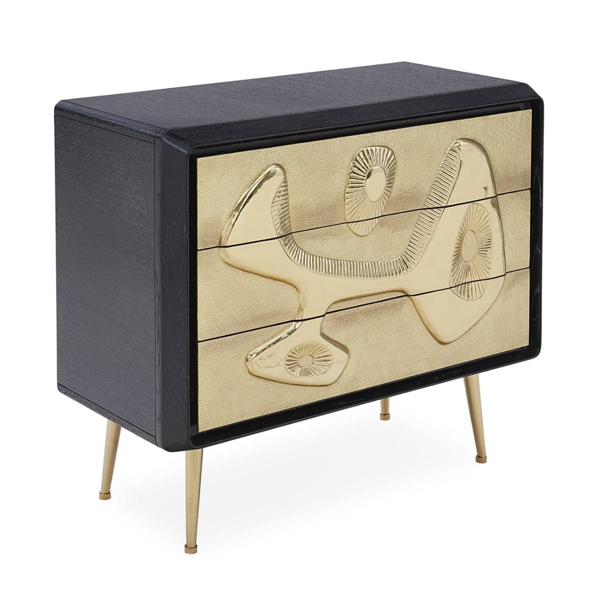 I’m a fan of the Reform three-drawer chest for its blend of mid-century form and contemporary detailing - the brass-relief fronts add just the right amount of sculptural interest without feeling over-the-top. It sits equally well in a pared-back Scandi scheme (let the black lacquer and brass shine against white walls) or a richer Art Deco setting with jewel-toned accents. As a practical styling tip, use it as a hallway console or beside the bed: keep accessories minimal - a simple lamp, low vase and a stack of books - so the drawer fronts remain the focus. Finish with a soft rug underfoot to balance the metallic sheen.