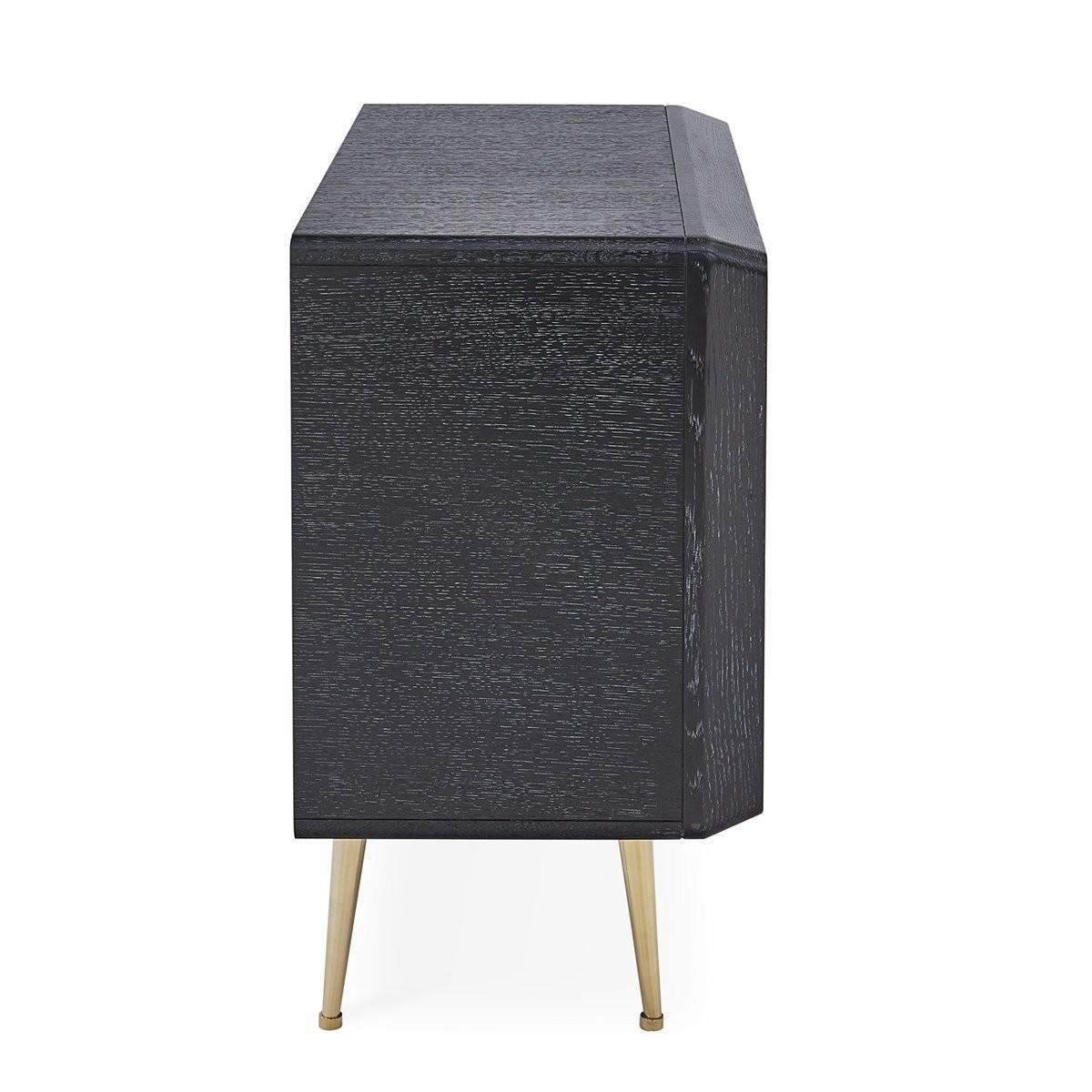 Organic Modernism. An ebonized and limed oak cabinet with drawer faces featuring our signature Reform design—a relief texture originally sculpted in our Soho pottery studio—clad in a sheet of brass, then hand-hammered and polished to perfection. Inspired by the Brutalist architecture of modernist temples and churches from Le Corbusier's Ronchamp to Miami's Temple Israel to the Cathedral of Brasìlia. Please note: Due to the materials and process used to create this piece, naturally occurring variances in the wood's appearance should be expected.