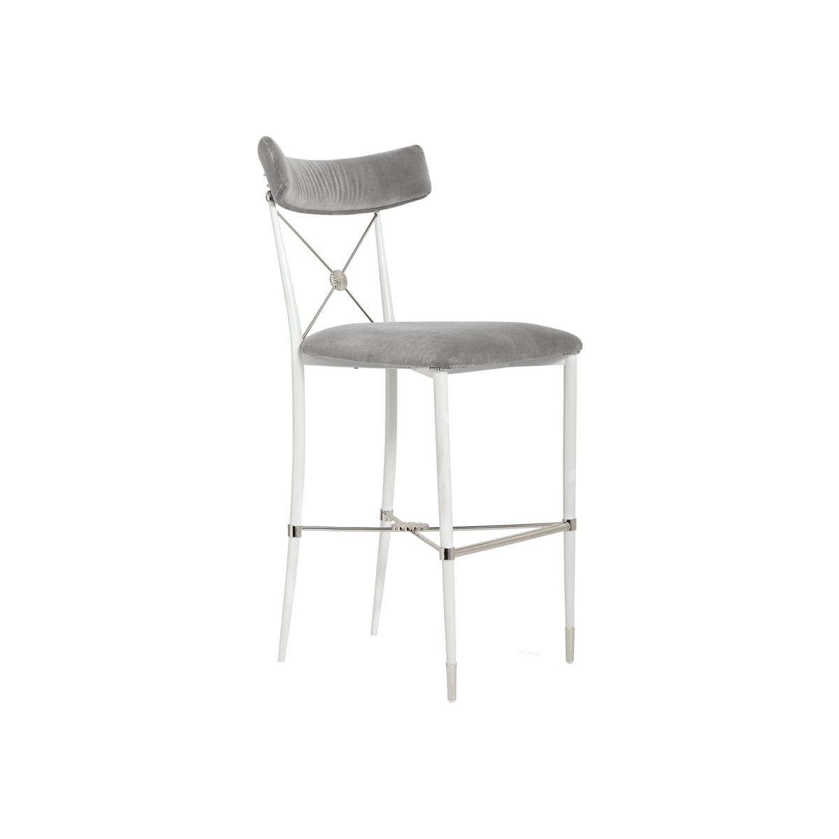 Parisian Flair. Our modern homage to an Empire-style dining chair now perfect for your kitchen counter. Our Rider Counter Stool balances Parisian bistro with bar seating—and ultra comfort. Choose from the classic blackened metal frame with brass sabots and escutcheon or the twinkly glamour of the white metal frame with nickel accents.