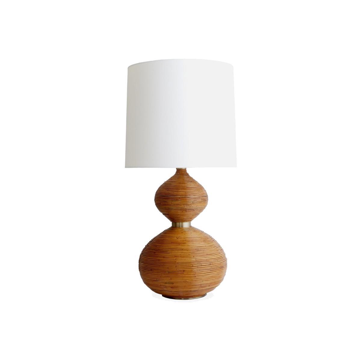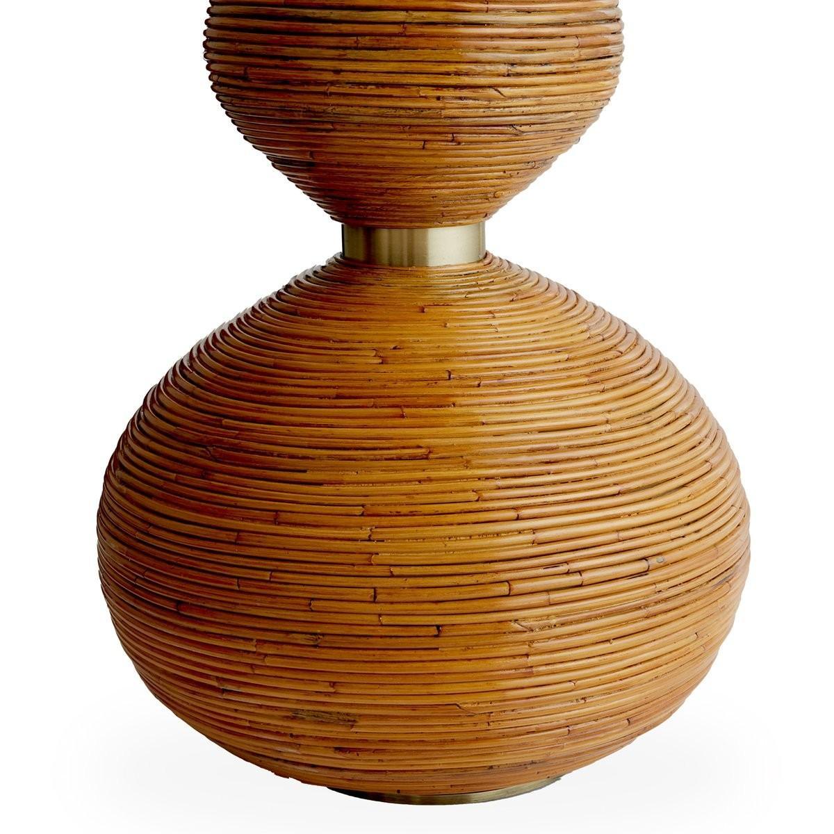 Global Craft. Featuring split reeds—first steeped in water, then hand-applied and fastened to framework—finished in a honey-toned stain coated with glossy lacquer, our Riviera Table Lamp is the update on classic French 50s rattan you've been waiting for. Cinched with a brass cuff, its classic double bulb silhouette is a rich, room-warming neutral worthy of its sun-drenched namesake. Topped with a crisp white spider shade.