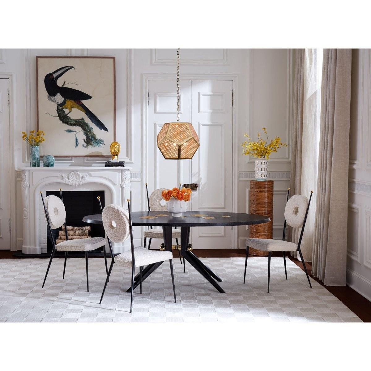 I’m a fan of the Rondo chair for its clean, sculptural lines and the playful circular detail on the back - it feels both of-the-moment and timeless. The slim black frame and boucle upholstery sit neatly in contemporary, art-decó or even pared-back Scandi schemes, adding just enough flair without overpowering the room. For styling, tuck a row of these chairs around a marble or light-wood table and introduce brass or gold accessories to mirror the subtle metal finials. It also works well as an occasional chair in a hallway, paired with a slim console and a bold rug.