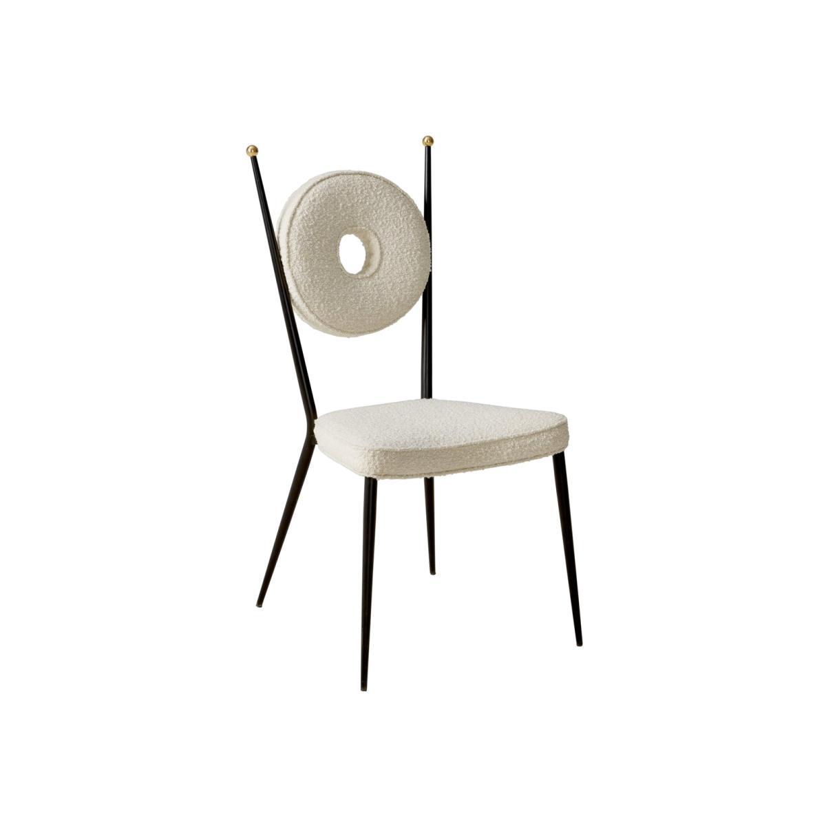 Circle Back. Featuring a blackened steel frame holding a chic donut back cushion suspended, our Rondo Chair is a looker. Topped with polished brass spheres for an extra glint of glamour and fitted with a shapely seat cushion, Rondo's warm oatmeal bouclé is a comfy finish. Perfect for pairing up to flank a console, or let one steal the scene as a standalone statement.