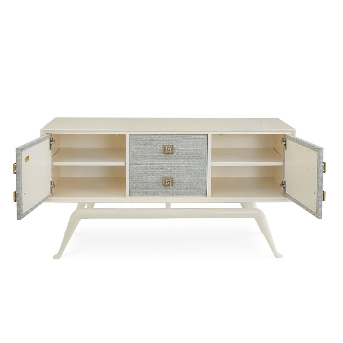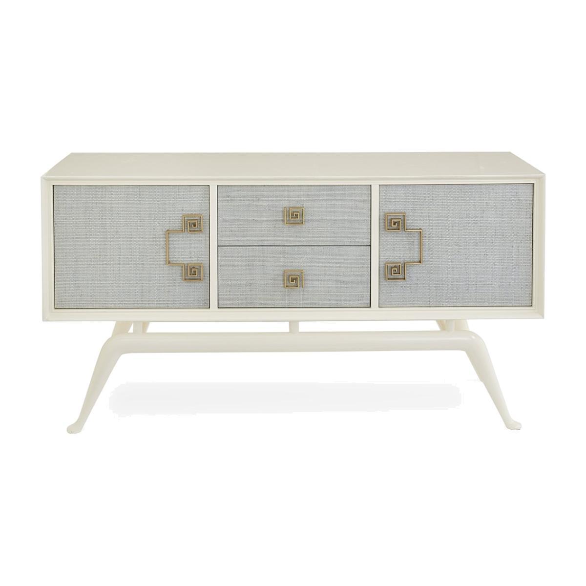 Revolutionary Raffia. Our exotic Siam collection gets a fresh new feel. Featuring a solid mahogany base coated in ivory lacquer and topped with a case faced with natural raffia that has been painstakingly stained and applied in layers of sky blue lacquer to exquisitely icy effect. Brass accents and hand-hammered brass Greek key hardware add the finishing touches. Inspired by Jonathan's trip to Jim Thompson's legendary house in Bangkok, our Siam collection is what you'd dream of inheriting if your eccentric great aunt had been besties with Tony Duquette.