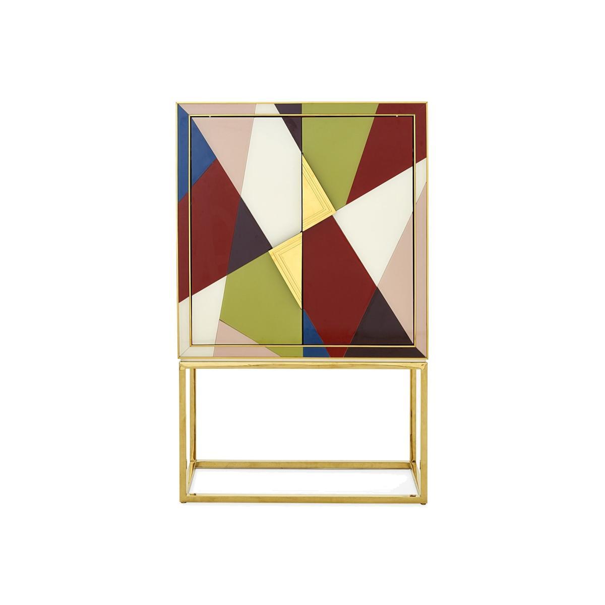 Chic, Graphique, Instant Classique. Featuring glass panes reverse-painted in a rich and moody palette, our modernist Torino Bar cabinet elevates in-home entertaining. Polished brass details bring the glam, while angular door pulls give it extra edge. Fitted with adjustable tempered glass shelves, plus six wire-bound drinking glass shelves inside the doors. Two tray drawers at the base keep your mixing accoutrements at hand.