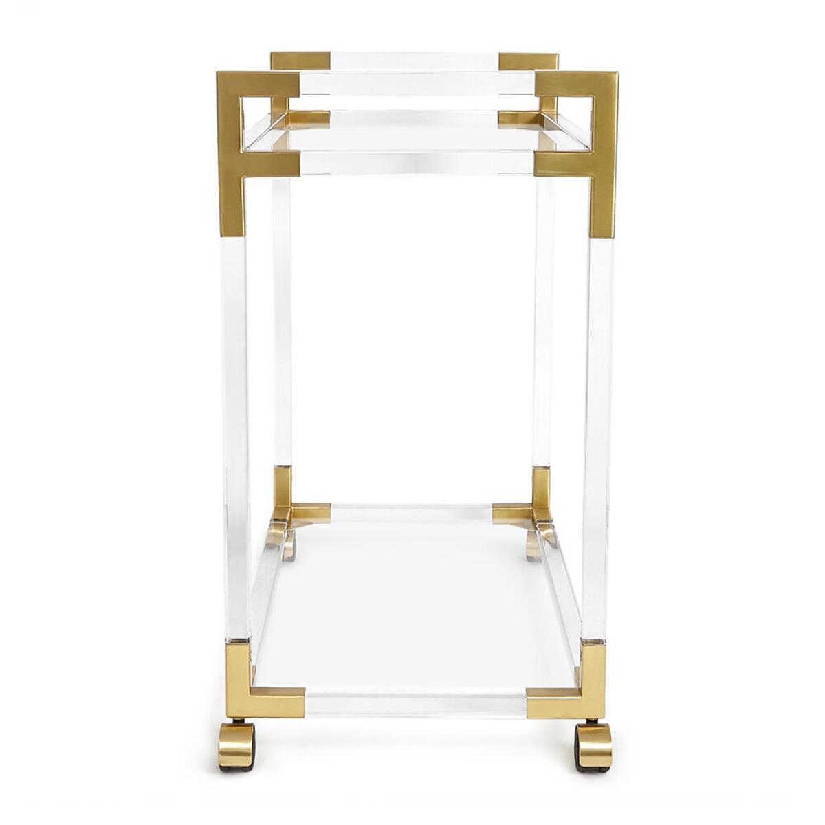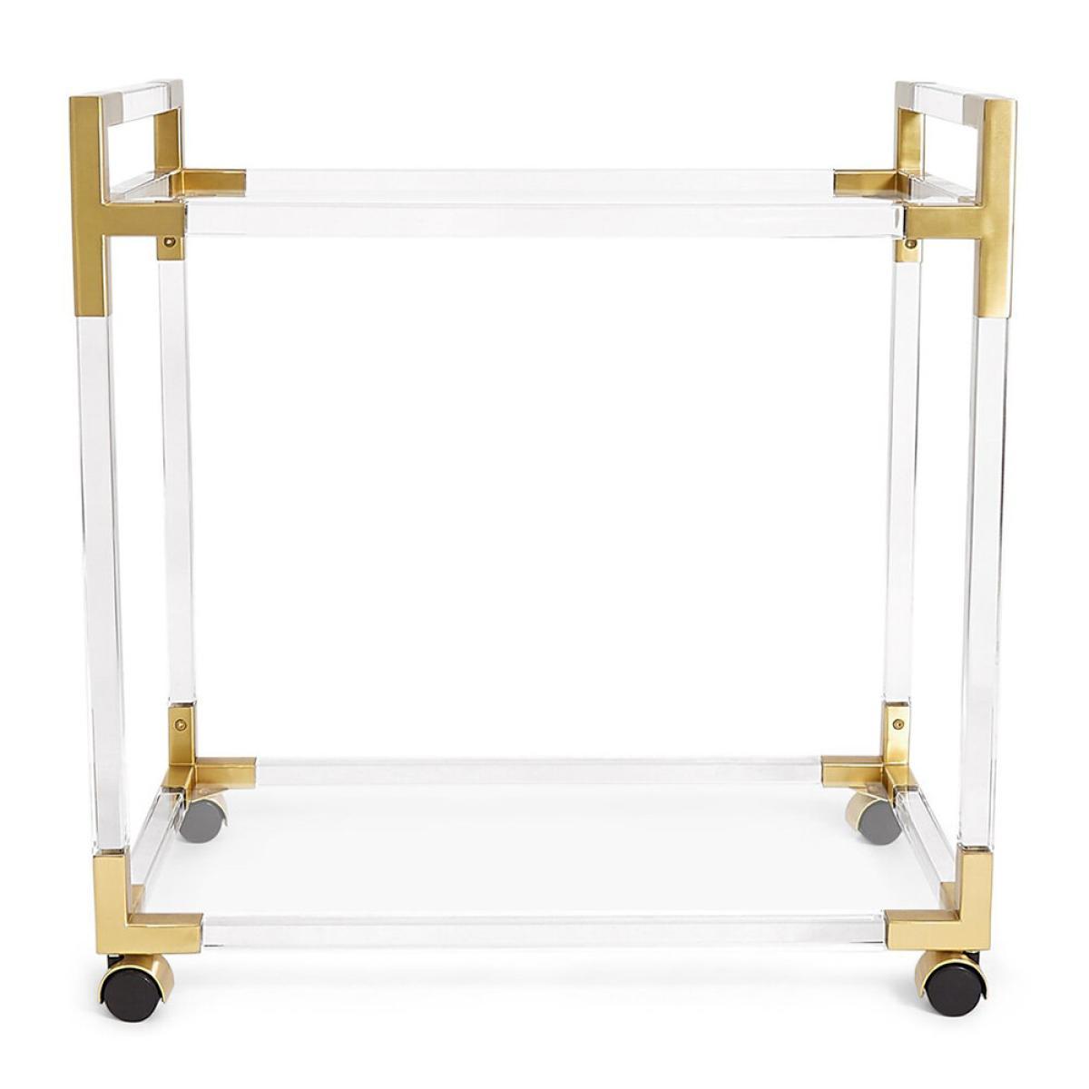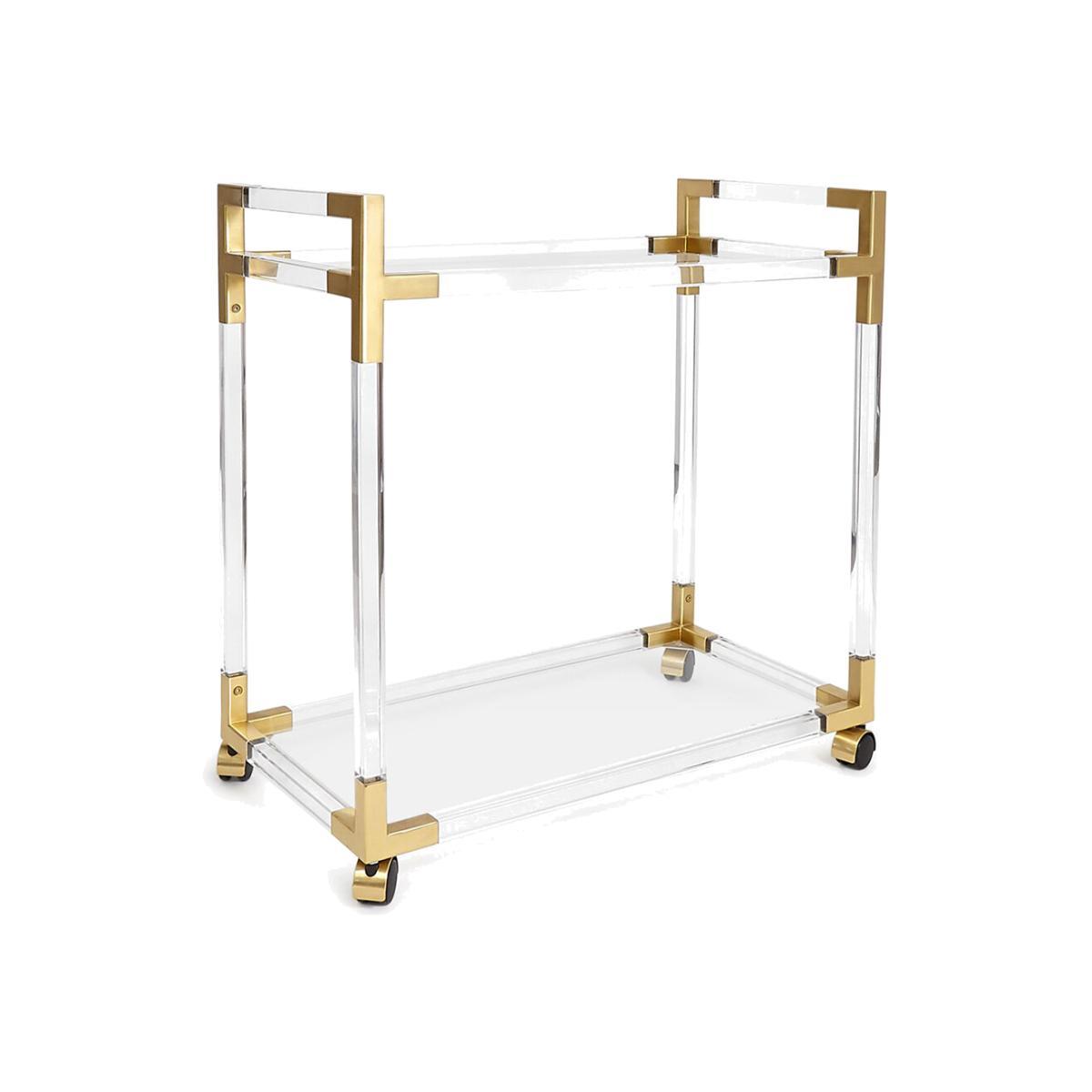 Bring the party home with this Jacques bar cart from Jonathan Adler. Featuring a crystal-clear acrylic frame with contrasting brass details, it is finished with two tempered glass shelves perfect for keeping your favourite tipples close to hand.