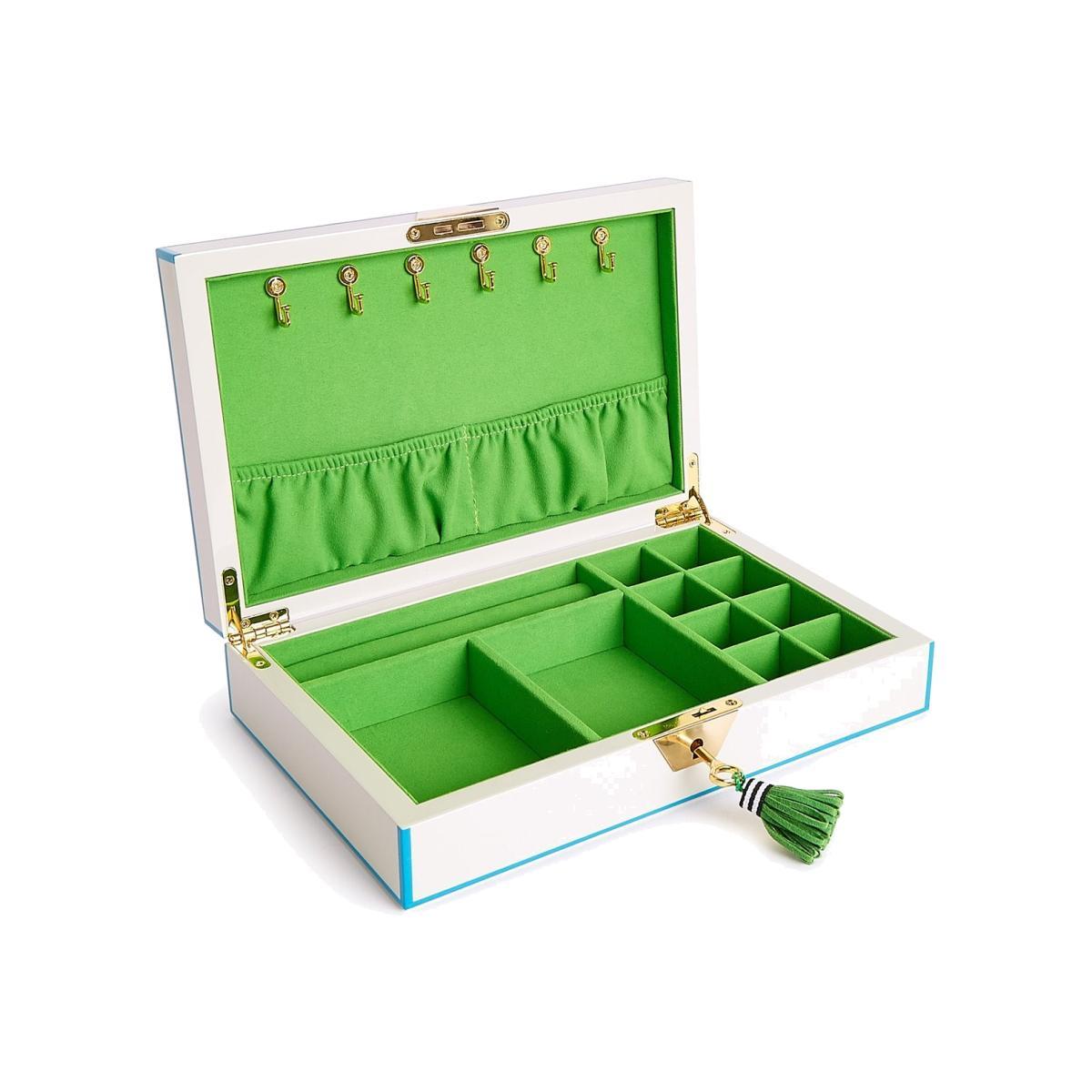 Stash in Style. Bring Upper East Side elan to your baubles with our Lacquer Jewellery Box. Gold, silver, or diamonds will look even more luxe in the velvet-lined interior. White lacquer with turquoise trim and a kelly green velvet or fuchsia with navy trim and a navy velvet interior. Our signature hexagonal brass-plated keyplate is pumped up to preppy perfection by a matching key with tassel.