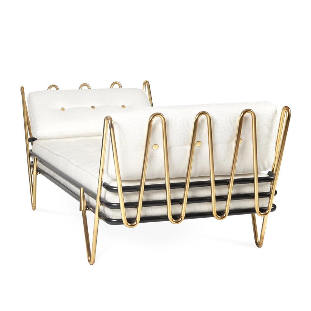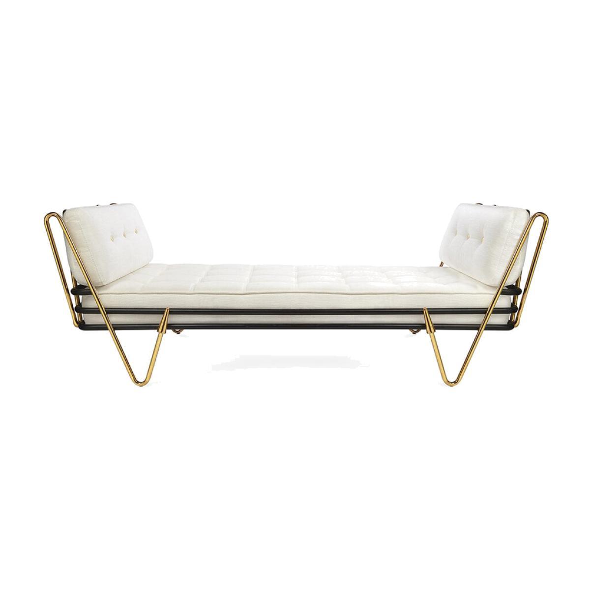Bring some mid-century modern style into your space with this Maxime daybed from Jonathan Adler. Featuring perfectly plush white cushions and bolsters with a contrasting polished brass and black metal frame, this effortlessly chic piece will bring that forgotten corner in your home to life.