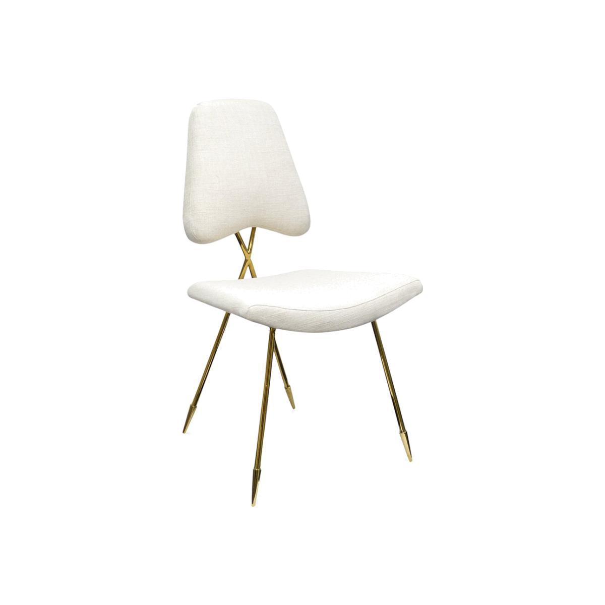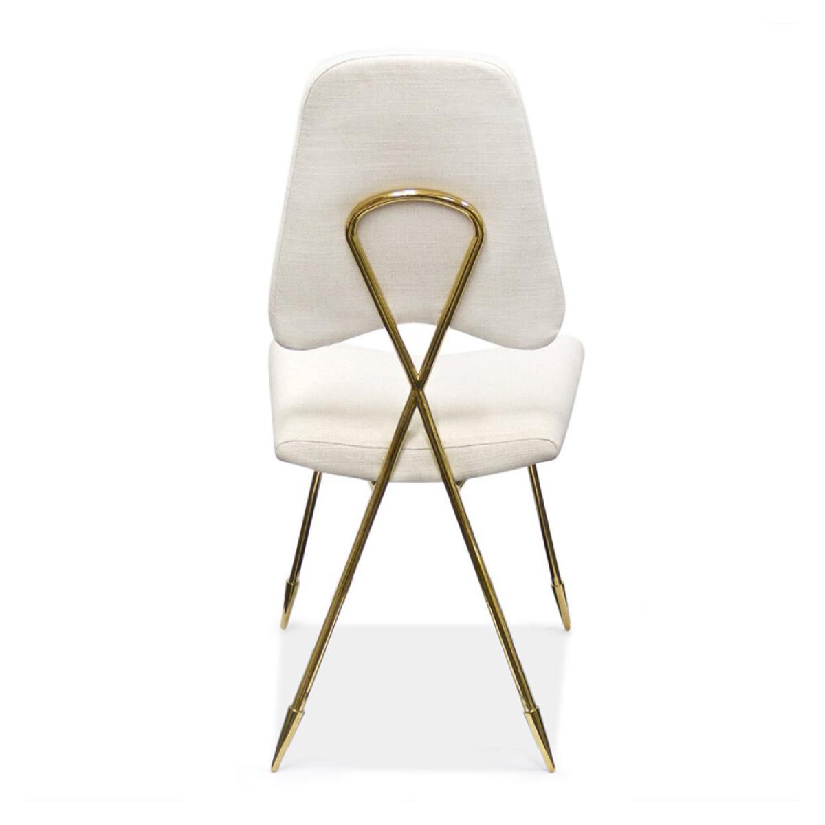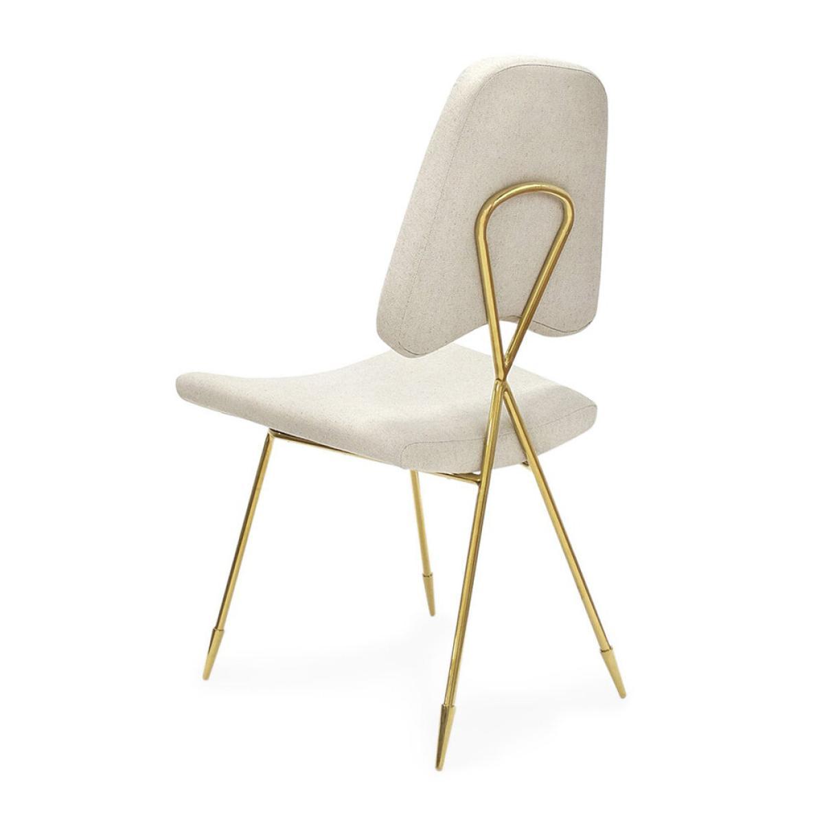 Inject some elegance into your space with this Maxime dining chair from Jonathan Adler. Boasting a polished brass frame with a crisscross back, it is complete with impossibly chic upholstery in a cream linen or grey velvet finish.