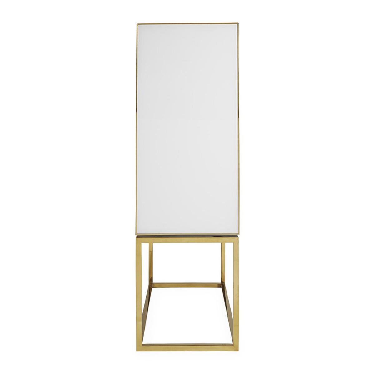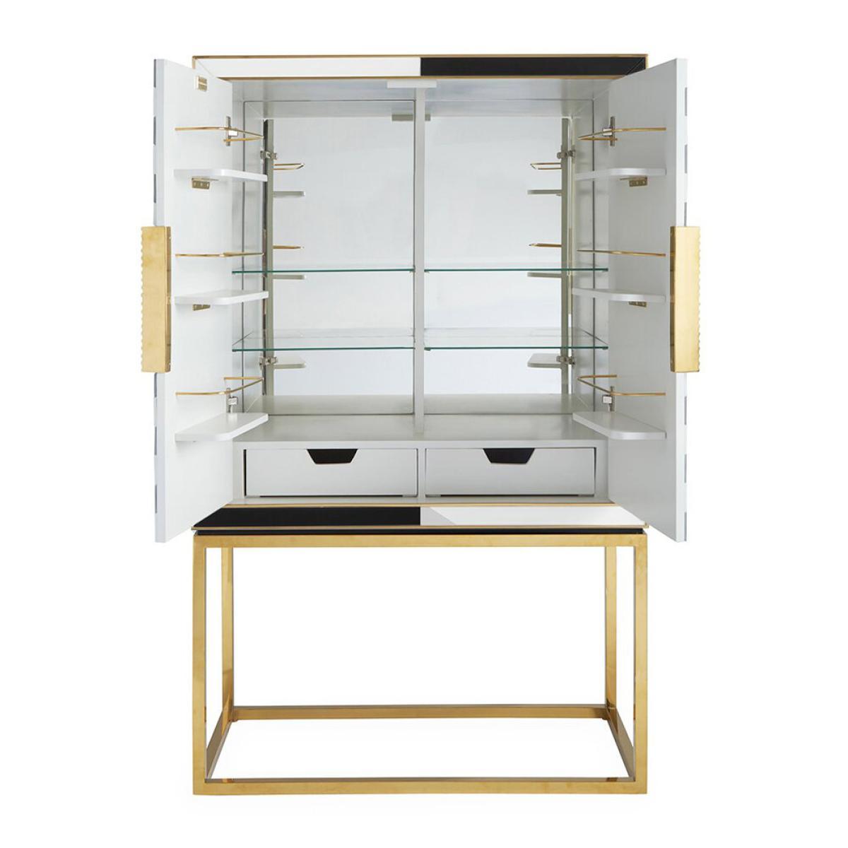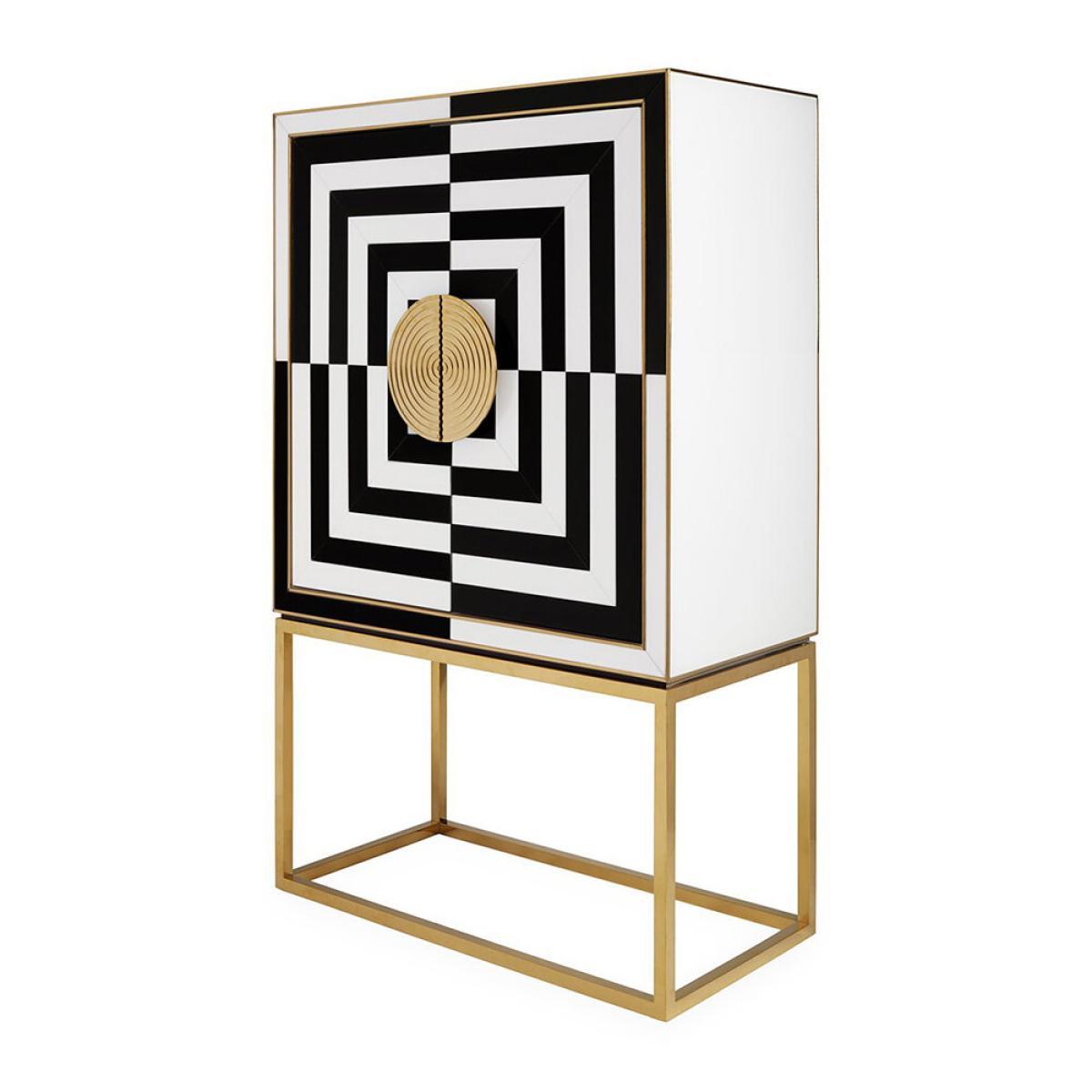 Take your home bar set up to the next level with this Op Art cabinet from Jonathan Adler. Boasting an art deco inspired design in charcoal and ivory tones, it is finished with split circle brass pulls that reveal four glass shelves inside. Complete with six wire bound drinking glass shelves inside the doors and two sliding draws to keep your tipple tools at hand, this striking cabinet will pack a punch in your home.