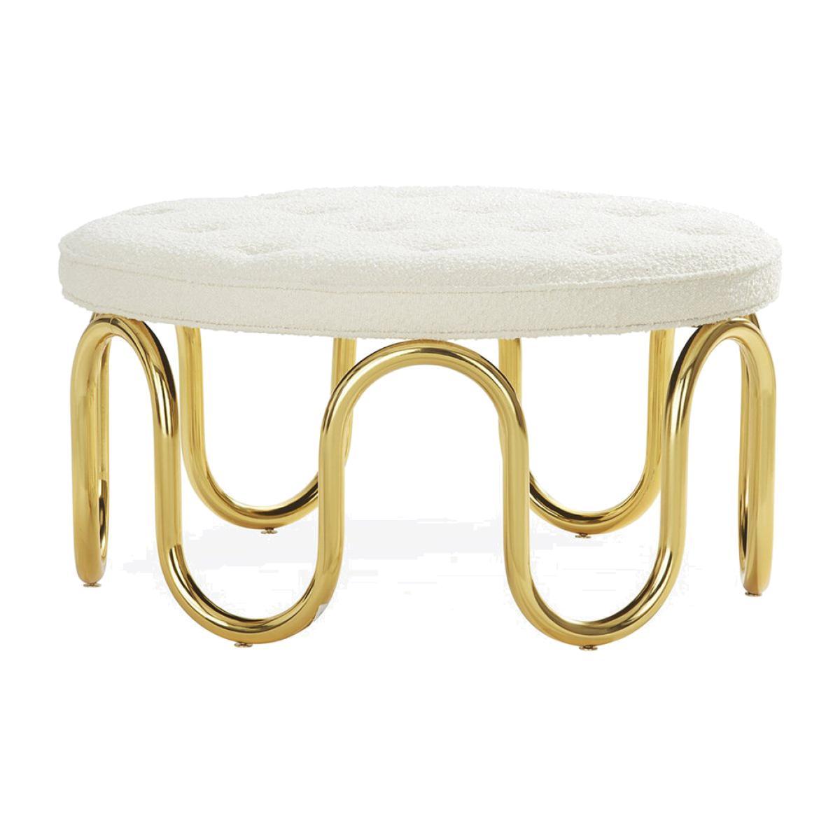 Bring surreal glamour into your space with this Scalinatella ottoman from Jonathan Adler. Featuring a striking gold base made from a single sinuous brass tube, it is topped with a comfortable boule seat in a soft ivory tone.