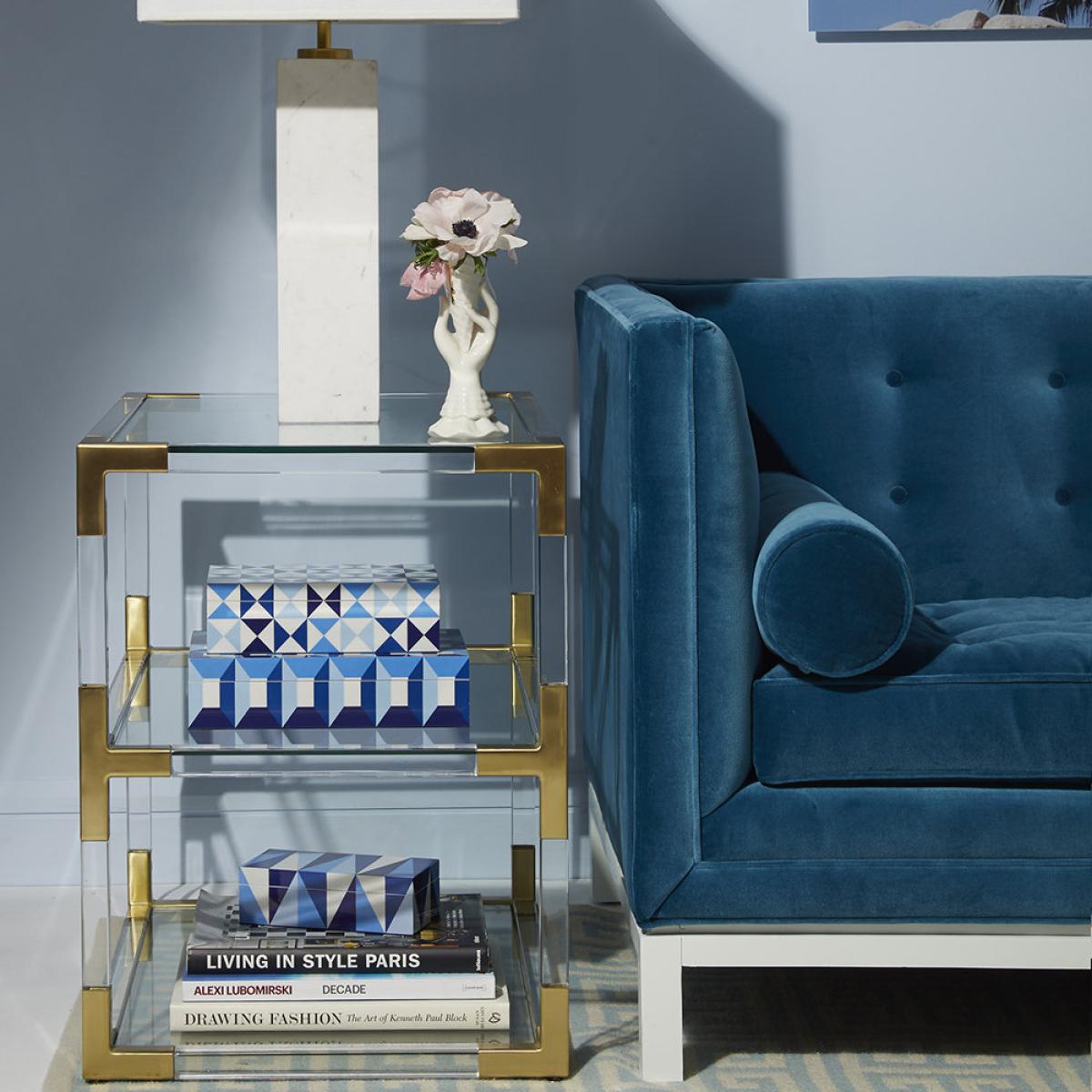 Bring trippy dimensionality to your shelves with this Sorrento trinket box from Jonathan Adler. Adorned with hand finished geometric patterns in brilliant blue shades, this box is available in three sizes for stashing, stacking or making a stand-alone statement.