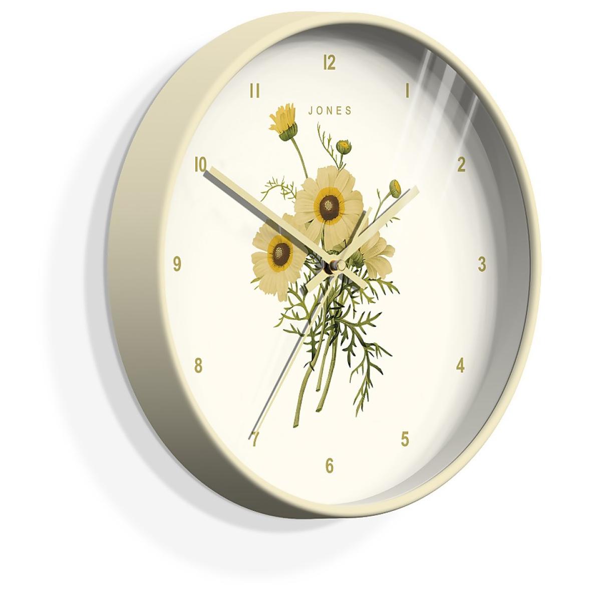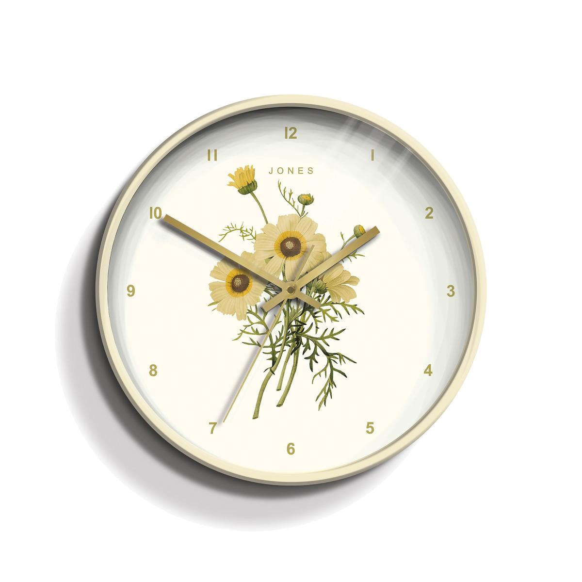 The Jones Botanical is a modern wall clock, featuring a beautifully illustration of a daisy on a white background.