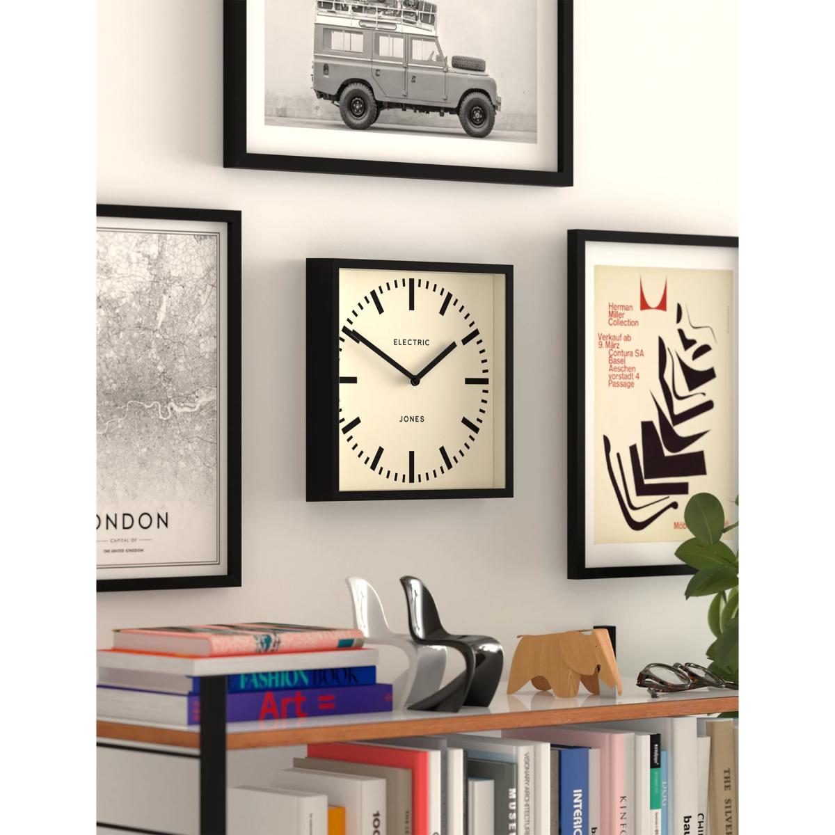 I really like the Jones Clocks Box Wall Clock for its sleek, minimalist design, making it a versatile piece that suits modern and contemporary interiors. Its black frame and clear face provide a striking contrast that works well in monochrome schemes or as an anchor in more neutral spaces. It's particularly effective when placed in kitchens, home offices, or living rooms where clean lines and functional accessories are key. For styling tips, consider pairing it with matte black or metallic accents around the room to create a cohesive look. Avoid cluttering the wall around it, so the clock remains a focal point and adds a sense of intentional simplicity to your space.