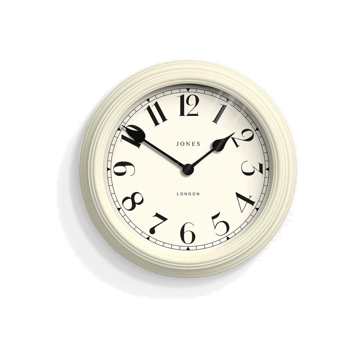 The Savoy wall clock from Jones Clocks has an easy-to-read Arabic numeral dial behind flat glass, framed by a decorative moulded metal case in a painted finish. This elegant clock is completed with metal teardrop hands.