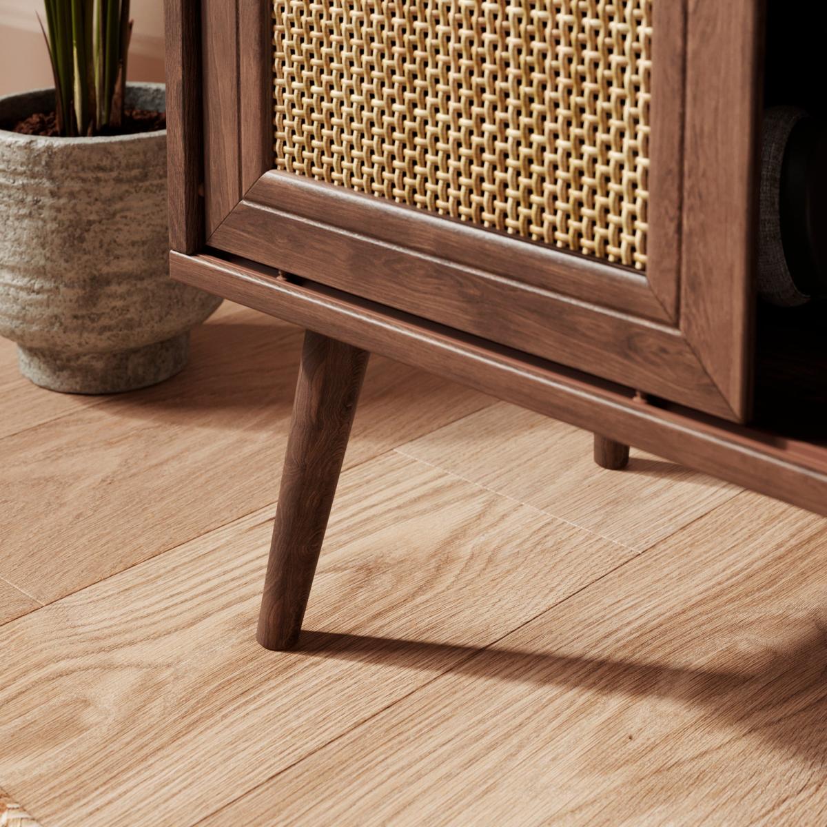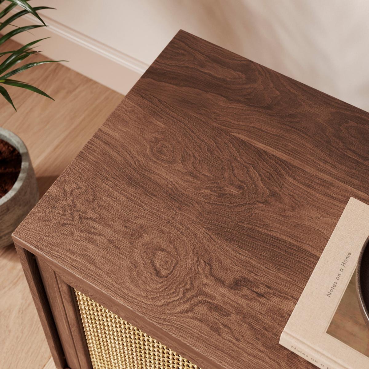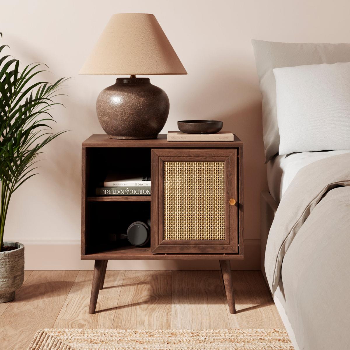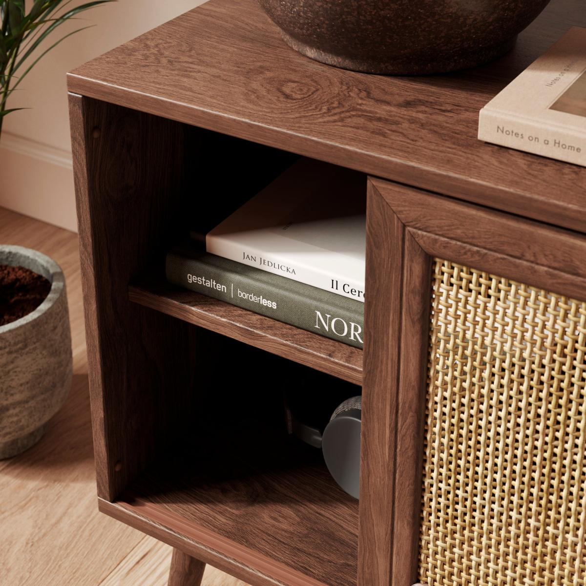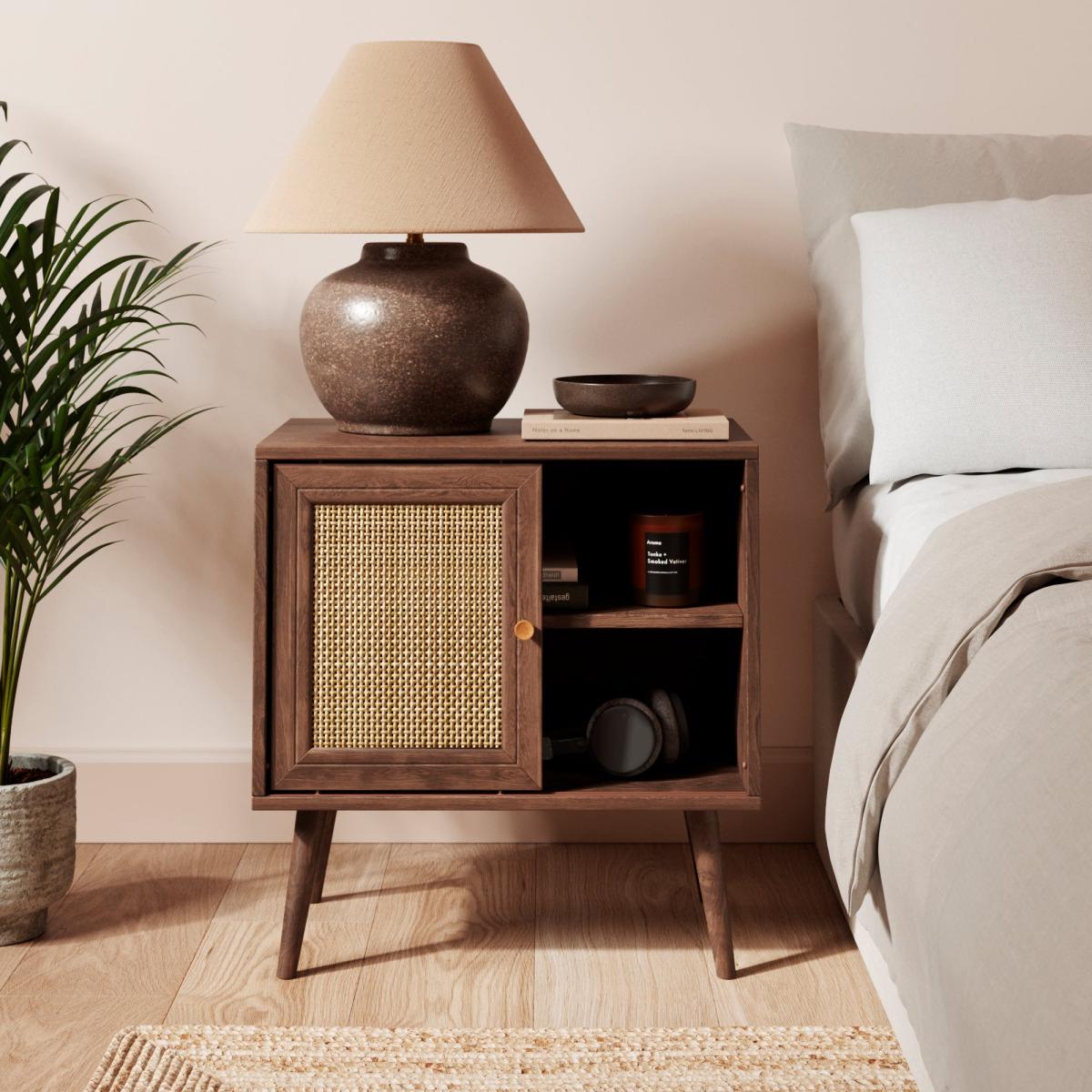 I’m drawn to this wide bedside’s warm walnut finish and woven cane door, which add texture without overwhelming a room. Its splayed legs and compact depth make it a great fit for both Scandi-inspired and mid-century schemes, pairing easily with neutral linens or a bold patterned rug. For styling, keep the top clear with a simple lamp and a low-profile plant, use the open shelf for your favourite reads and tuck chargers or small items away in the cabinet. Its versatile size also works well as a side table in a hallway or home office.