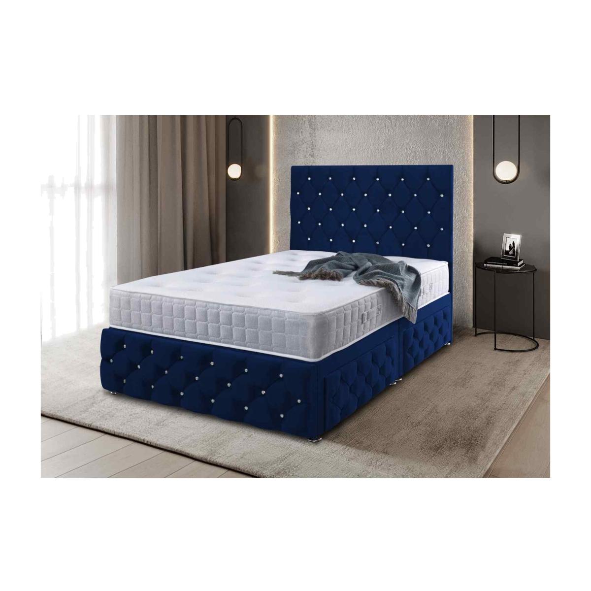 The all-new modern designer divan bed frame, handmade in the UK. Beautiful chesterfield upholstered headboard and footboard with diamantes with optional storage options. Upholstered sides to create a stunning all-around look. To complete the look this bed comes with chrome feet. This bed is sure to add a glamourous look to any bedroom setting. Recommended mattress is a 10 inch.