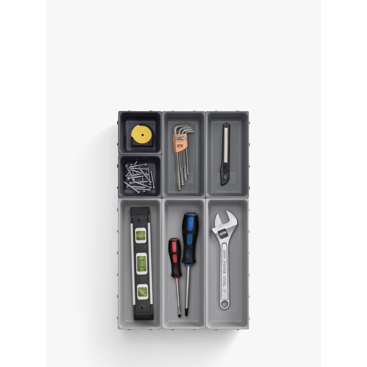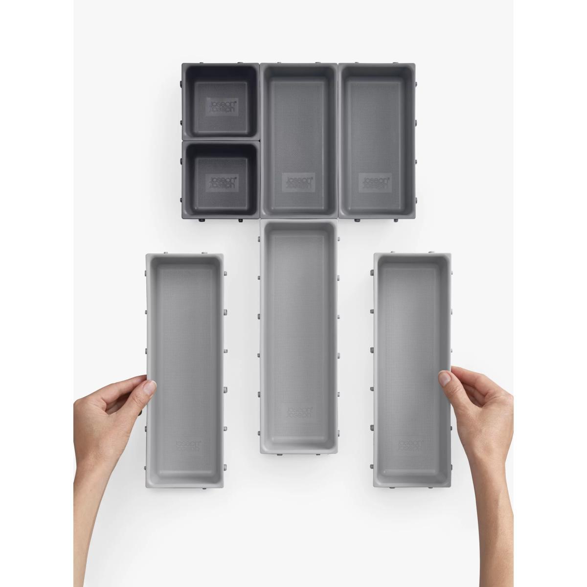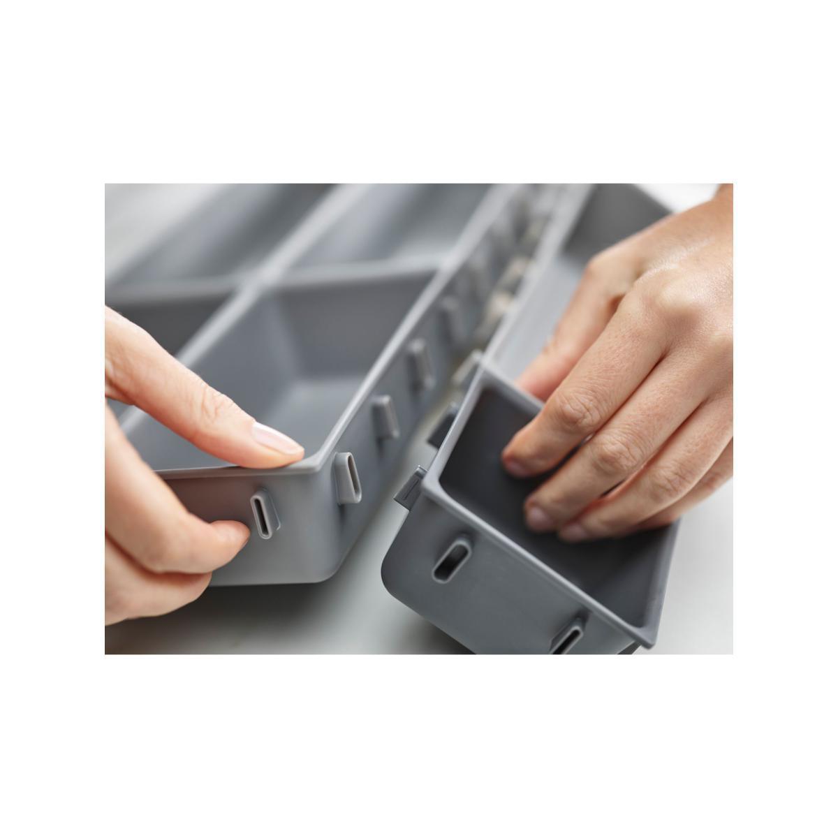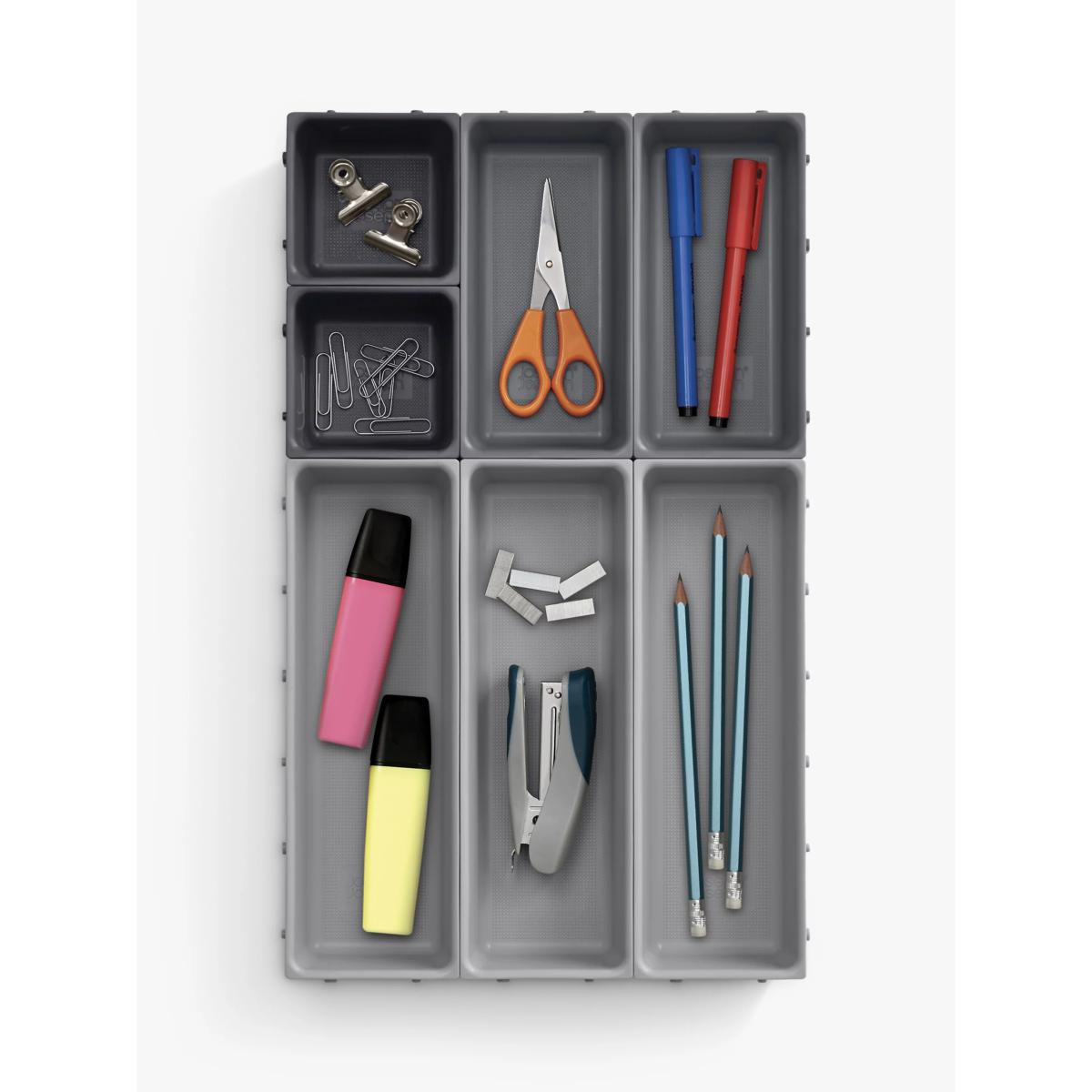 This modular design comprises seven individual trays of different sizes that are able to be clipped together on all sides, allowing you to arrange them in any order to fit your drawer space - they can even be divided and used in multiple drawers. To change the order, simply unclip each tray and rearrange as necessary. Perfect for organising and storing a wide range of household items such as cutlery, utensils, stationery, tools and craft accessories, the set also comes with self-adhesive, non-slip feet which can be applied once the final arrangement of trays has been decided.