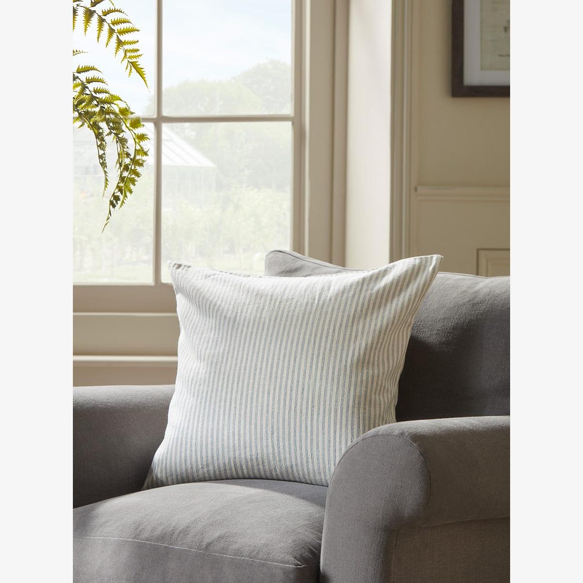 Cool pale blue ticking stripes against a natural background bring a fresh spirit to this simple Josephine cotton cushion cover.  An easy way to recharge a tired sofa or armchair, this cushion cover is also available in green.  This cushion cover is suitable for a 50cm x 50cm cushion pad which is available separately.