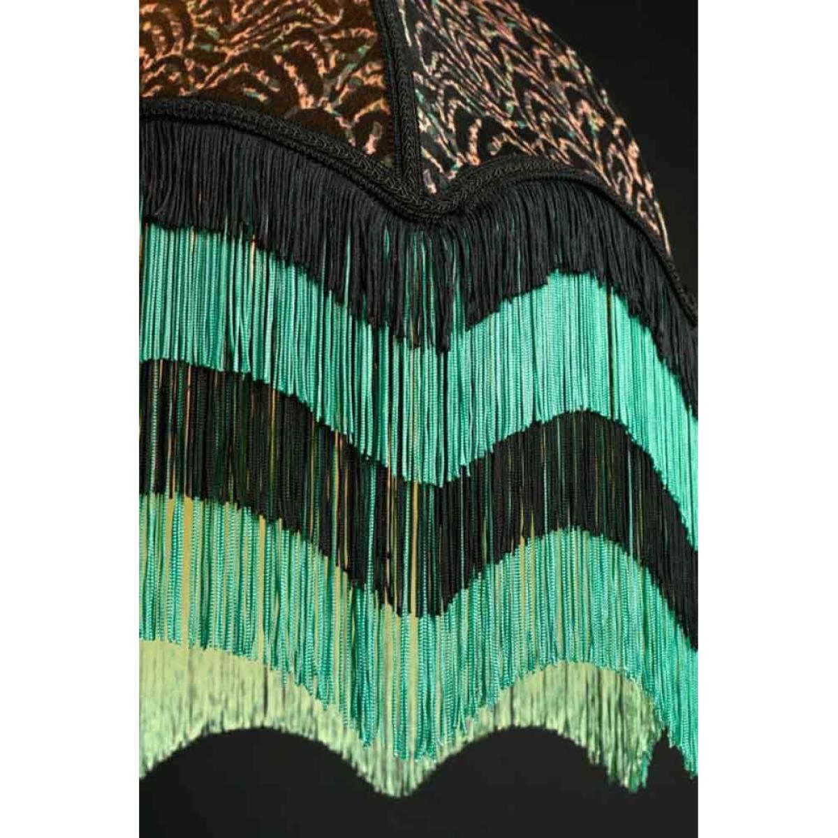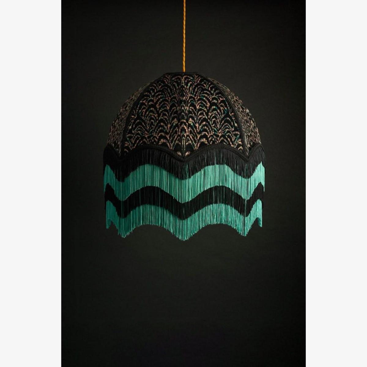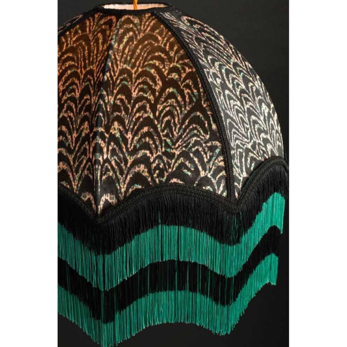 About The Anna Hayman Designs Josephine Lamp ShadeAvailable in four functional sizes and two plush fabrics, the Anna Hayman Designs Josephine Lamp Shade features an alluring ink painted print in an exquisite turquoise, pink and cream colourway. Showcasing a dazzling art deco edge, this statement lamp shade is finished with a four-layered fringe in alternating sea green and black colour palette. This velvet lamp shade will make a luxurious statement in your interior scheme styled as a beautiful pendant shade or a lamp shade. Intricately handcrafted by Anna Hayman Designs in Sussex, these shades are fully lined with a choice of white or gold lining. We also offer a choice of lamp or hanging pendant attachments so you can style this quirky lamp shade as the focal point of a room or as an accent piece on a side table. With the option between two sumptuous fabrics, Duchess Satin or plush Velvet, this elegant lamp shade will make for a luxurious statement in your home. Available in XL, L, M & S, you won’t be disappointed with the shade you receive, it is truly a piece of art!Why We Think You’ll Love The Vintage Lamp ShadeA glamorous interior treasure, should you desire a brighter glow we suggest opting for the Duchess Satin fabric. However, if you prefer the sumptuous texture of soft velvet then we recommend using a high voltage bulb so the glow radiates through the luxurious fabric. Showcasing outstanding craftsmanship, this unique lamp shade is made by highly skilled artisans in the UK who carefully stretch and trim the plush fabrics over the frames with extreme care. Where To Style The Art Deco Lamp ShadeFor an ultra dazzling look that welcomes the Art Deco era into your home, style the extra large lamp shade as the focal point of a living room. It will make for a totally eye-catching centrepiece displayed amongst other gold accents such as gold ornaments and decorative delights. Alternatively, use the lamp attachment and upcycle an existing lamp base in your home and display this satin lamp shade on a side table or sideboard for an interior scheme that boasts a show-stopping style.