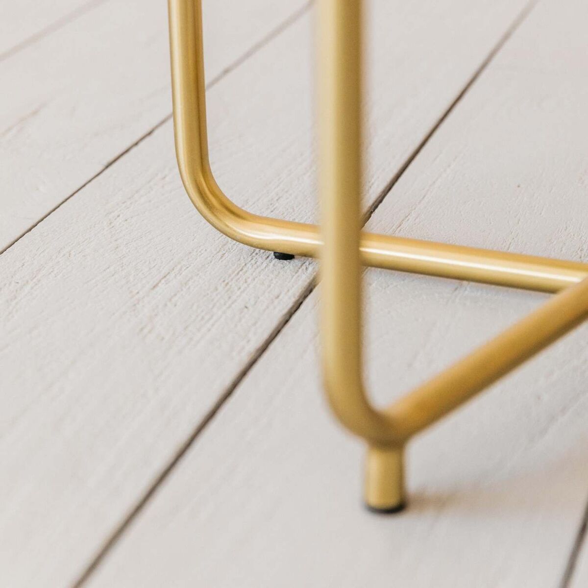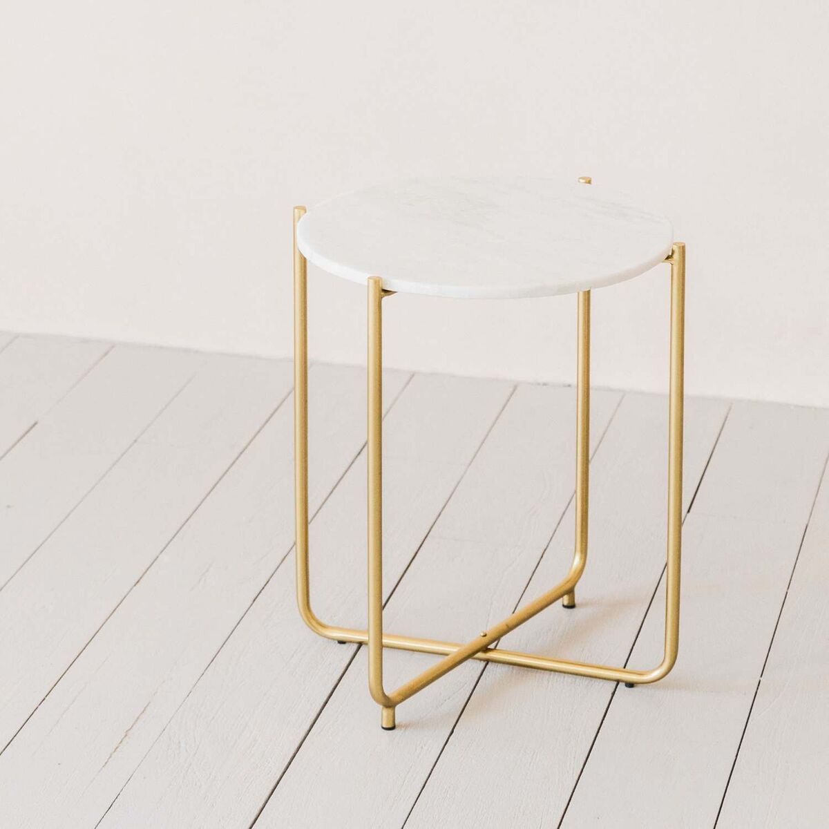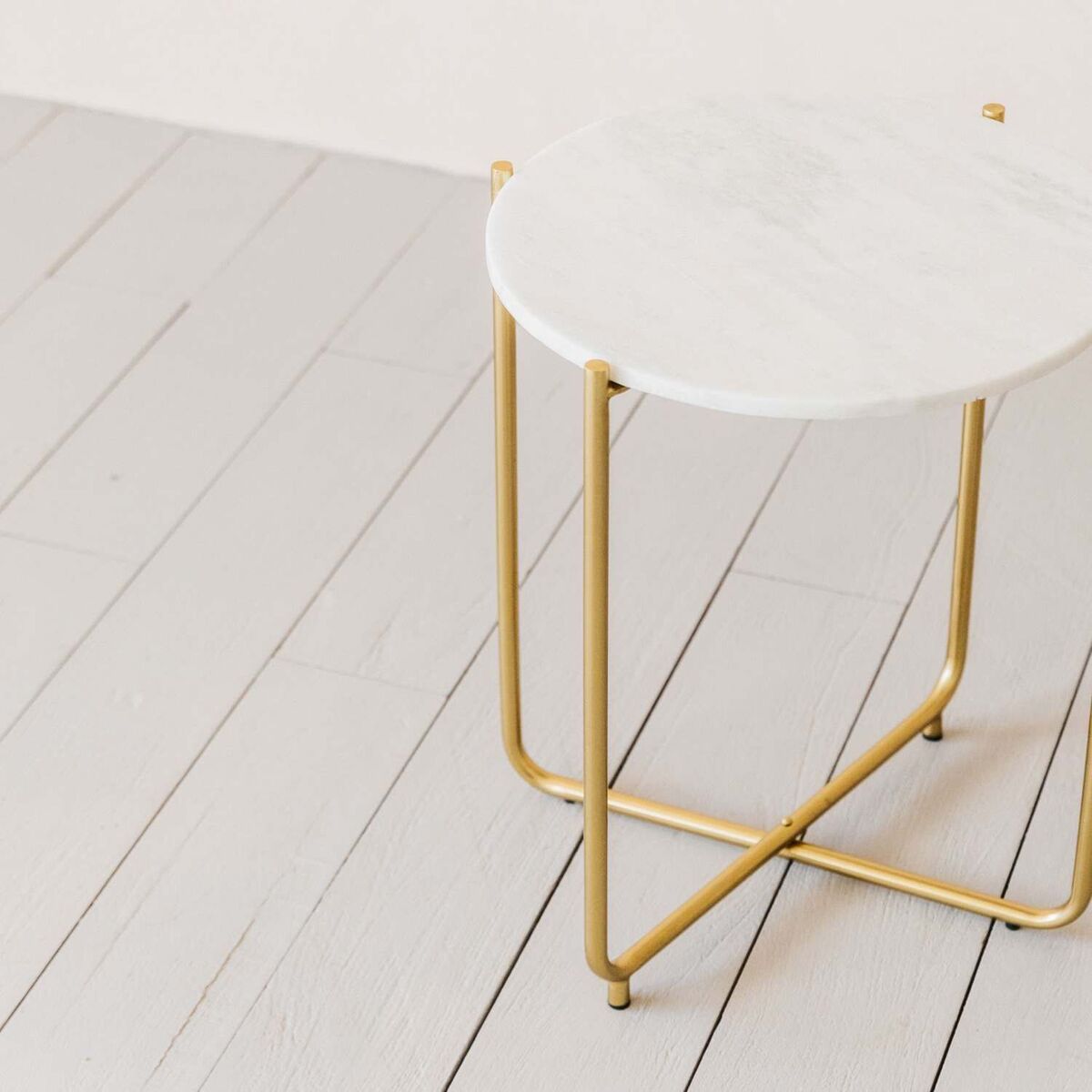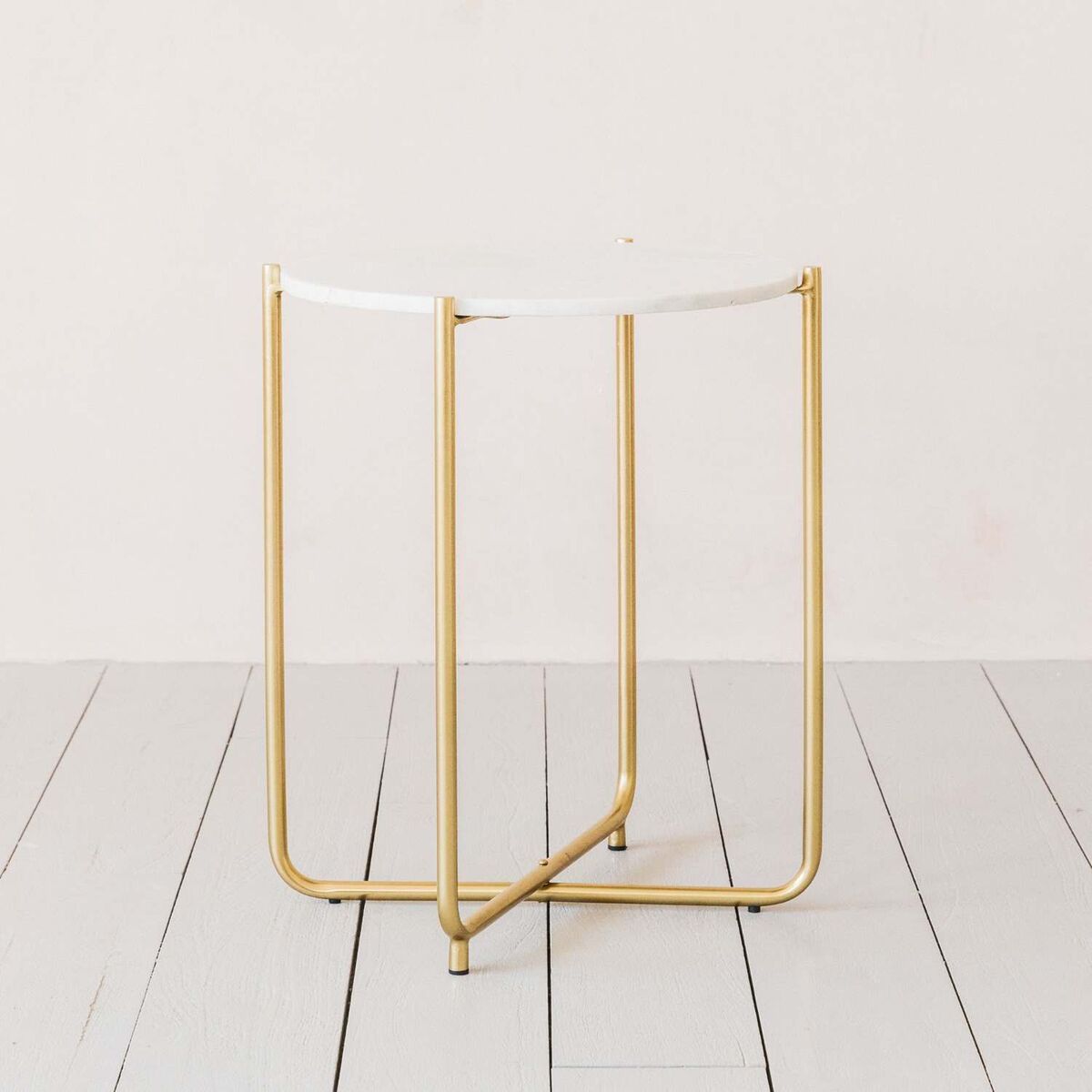 An opulent addition to your living space, our Joss side table promises to add an elegant element to your interior. Crafted from iron with a metallic brass finish, this contemporary piece features four sleek legs with a cross support and a circular white marble top.
