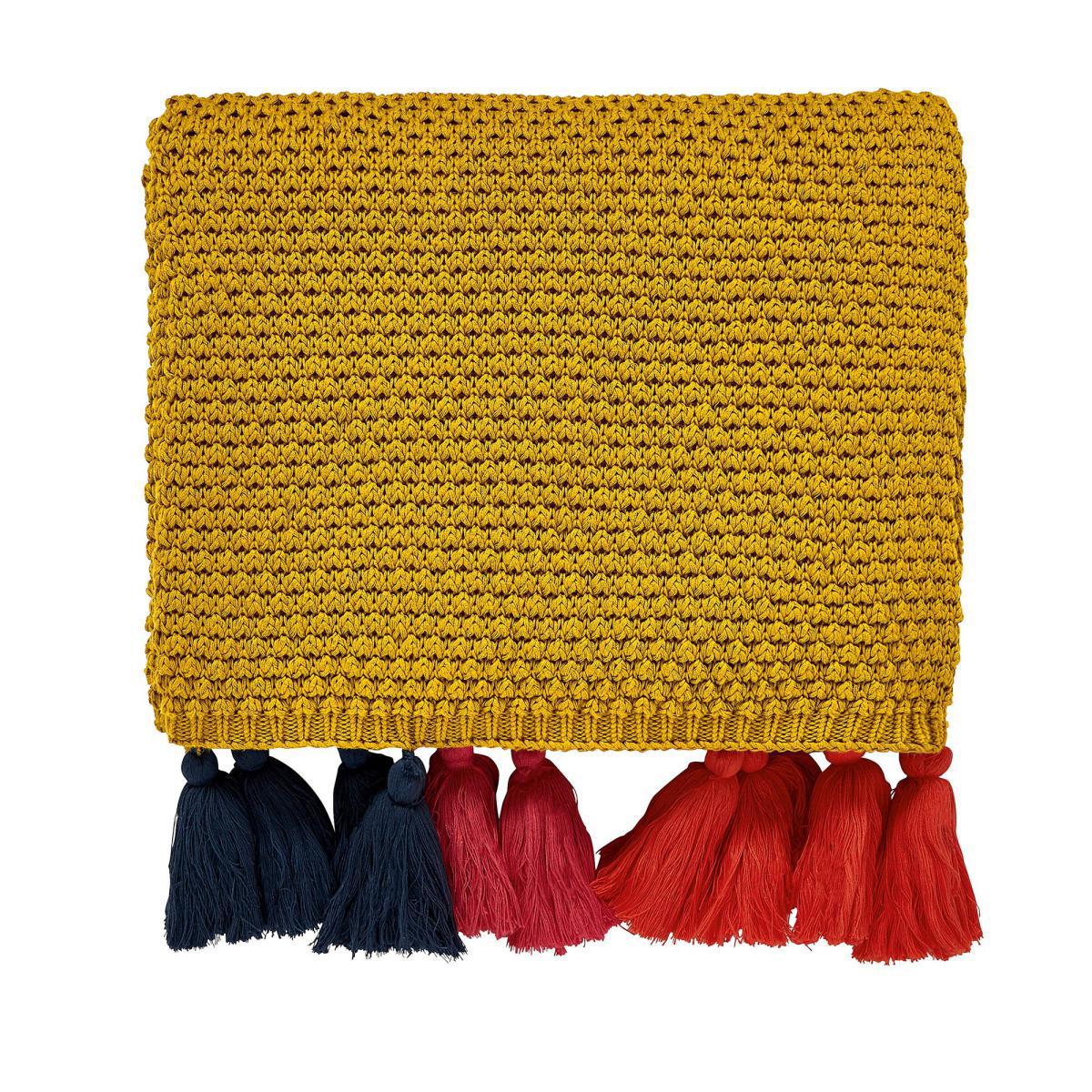This antique gold throw will finish off your Cambridge Stripe bedding perfectly. The bubble knit technique used has made for a chunky finish and the multi-coloured tassels at each end add a vibrant pop of colour to complement the bedding. It's also a great size for draping over the end of the bed or cosying up under when it's chilly. Our throws are not flame retardant and are therefore not suitable as loose covers on upholstered furniture.