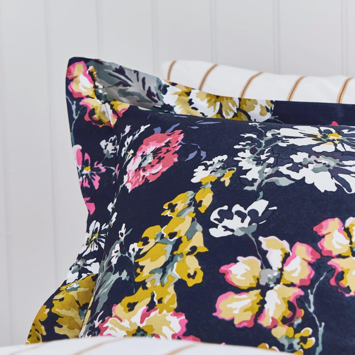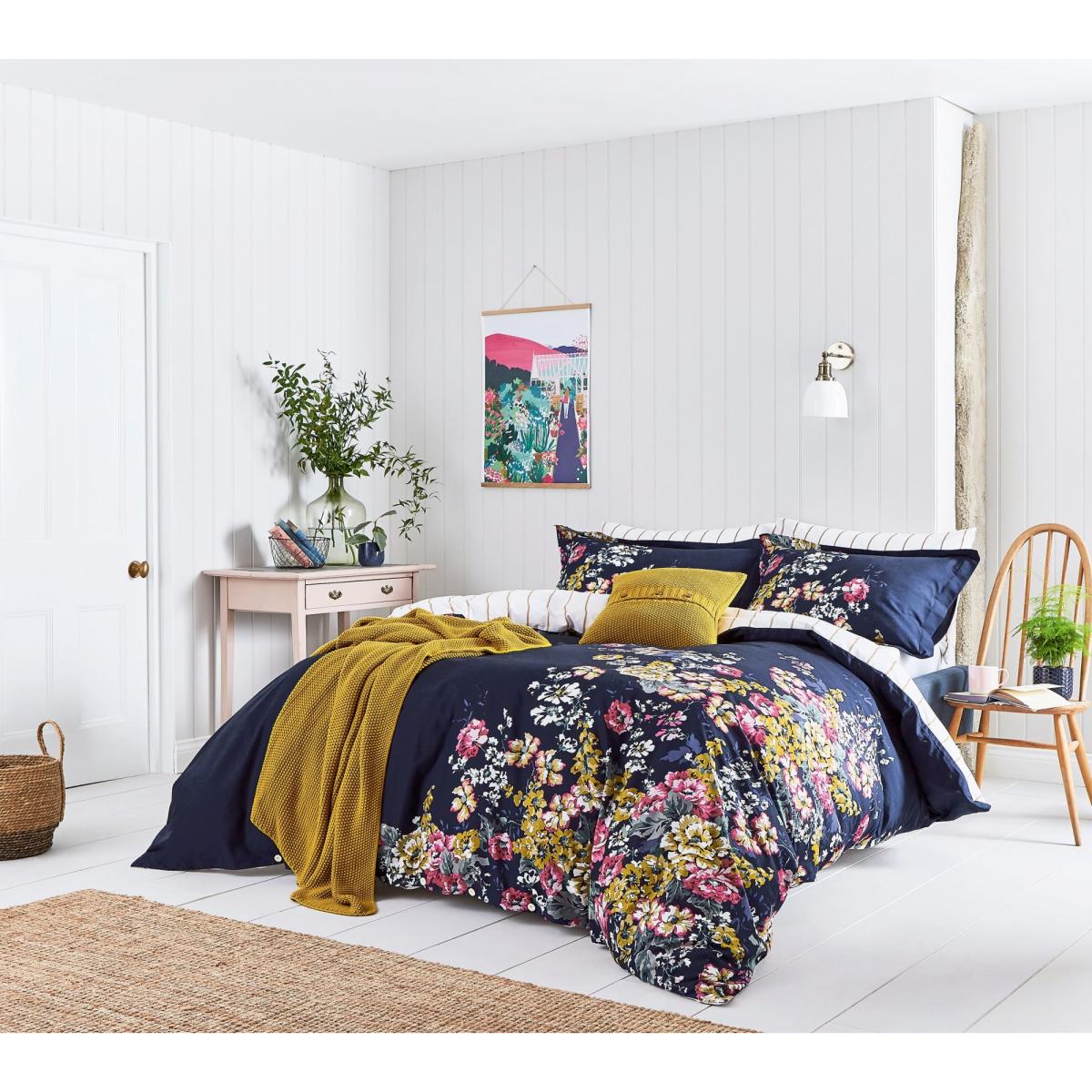 Bring a touch of timeless elegance to your bedroom with the Joules Cambridge Floral Duvet Cover Set in French Navy, featuring a beautiful floral design. You can always rely on a traditional Joules floral to brighten a bedroom (and your day!) This duvet set is adorned with a colourful hand-drawn print set against a classic French navy background while its reverse is a welcome contrast of antique gold vertical stripes. Features: 100% Cotton Percale Single Duvet Includes Single  Oxford Pillowcase Double, King and Superking Size Duvet Includes Pair of Oxford Pillowcases 180 Thread Count Reversible Care Instructions: Machine Washable Please note All screens vary in colour reproduction and whilst every effort has been made to display the colour as accurately as possible it is for guidance only.