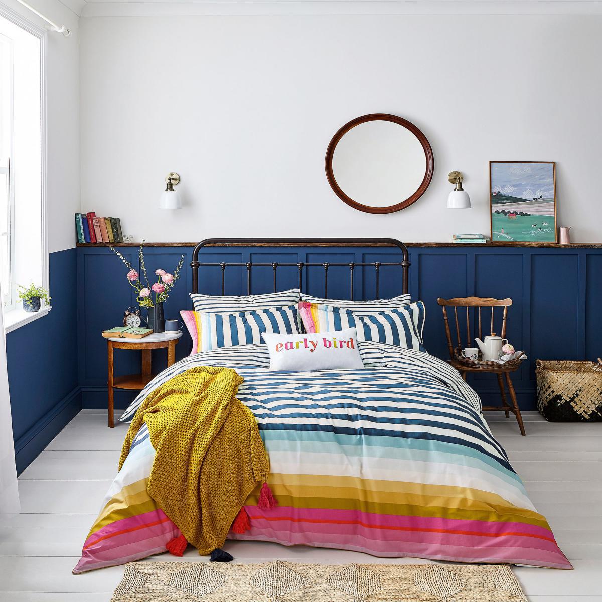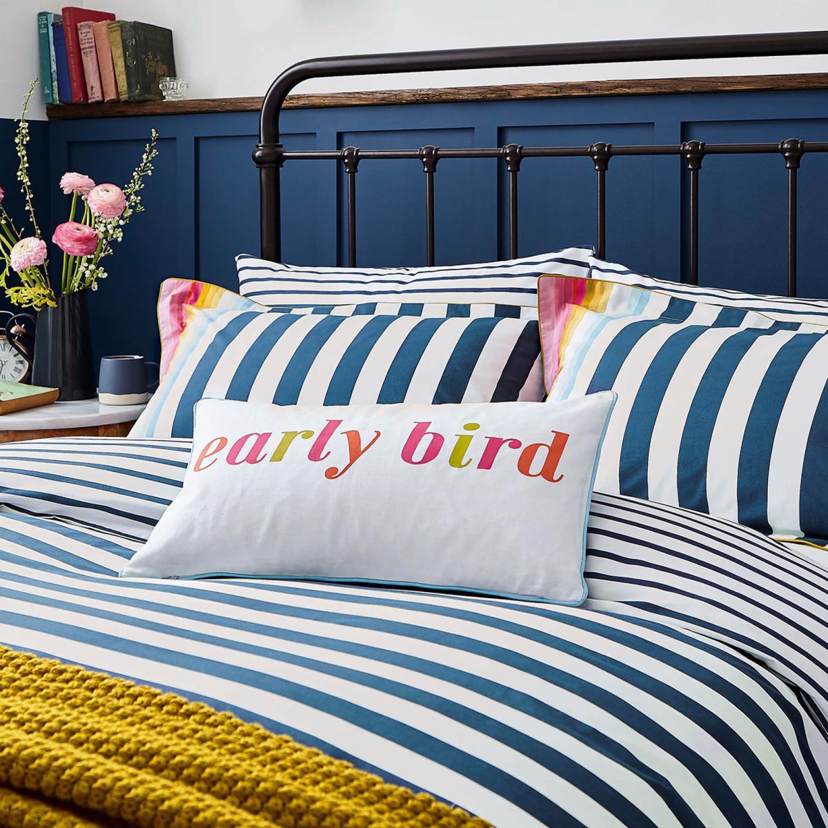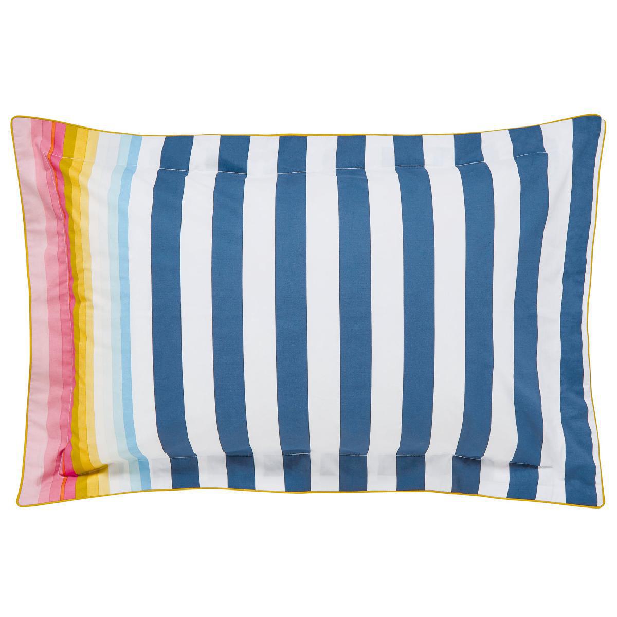 You'll always wake up on the bright side of the bed with this multi-coloured stripe duvet cover. Part of our Cambridge Stripe collection, it features a nautical inspired navy and white stripe which blends into multiple colours at the base. We've added antique gold piping for a luxurious finish and a thinner horizontal stripe reverse. Each set comes with two matching Oxford pillowcases (single sets come with ones) that mirror the print and piping for the complete look.