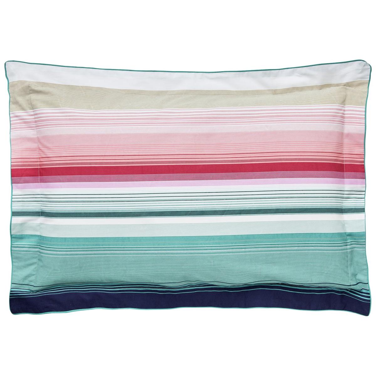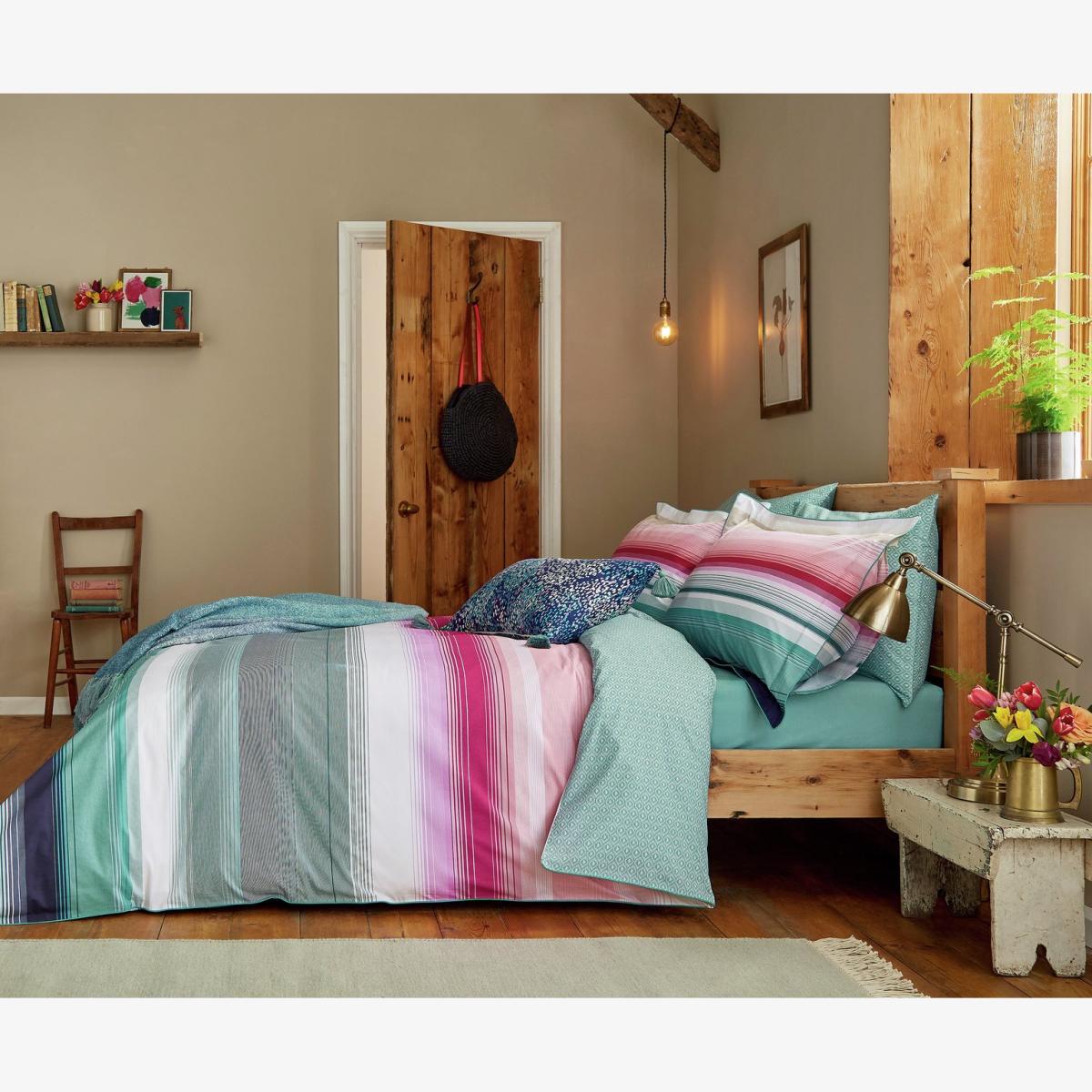 Whether you're an early riser or a lay-in lover, adding this striped duvet set to your bedroom will make sure you always wake up on the bright side of the bed. The set is bursting with an array of colourful horizontal stripes (inspired by the Cotswold floral print), all blended together in a soft ombre effect. For a touch of contrast the reverse features a geometric bee print in turquoise and white while the whole set is finished with green cord piping. The set comes with a duvet cover and two matching Oxford pillowcases (single sets come with one) with complementing standard pillowcases available separately. We are pleased to tell you that this product is made using sustainably sourced cotton. All over large scale multi coloured floral to the front with a fine blue and gold horizontal stripe reverse. Finish: percale. 100% cotton. 180 thread count. Set includes 1 duvet cover and 1 pillowcase. Bed size: single. Length 200cm, Width 135cm. Piped edging detail. Reversible. Buttons for fastening. Oxford pillowcase (s). Pillow case length 75cm, Width 50cm. Machine washable. Suitable for tumble drying.