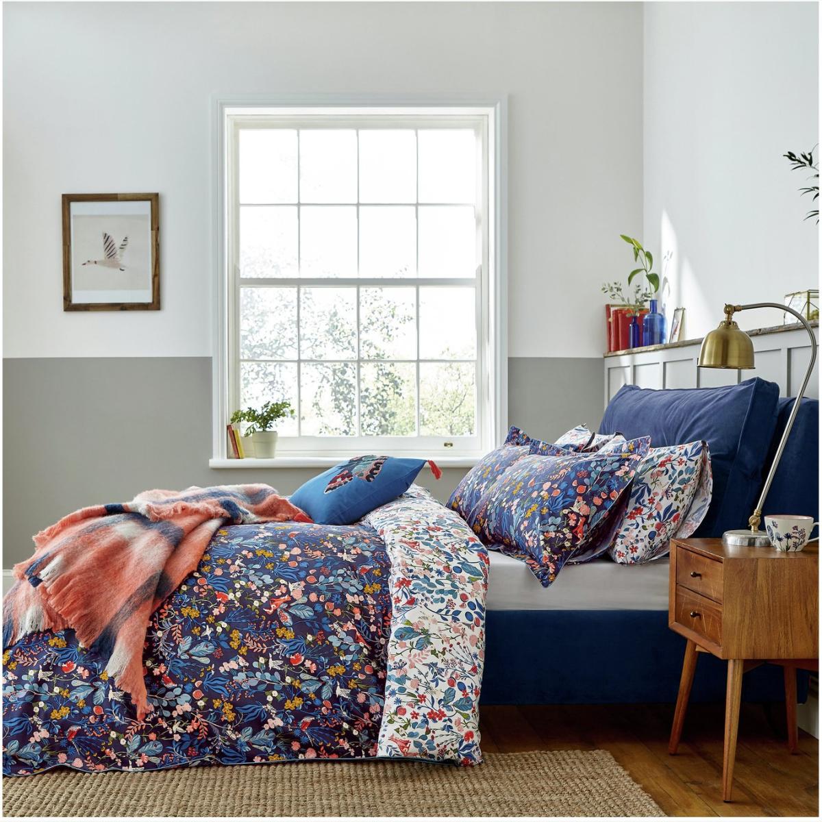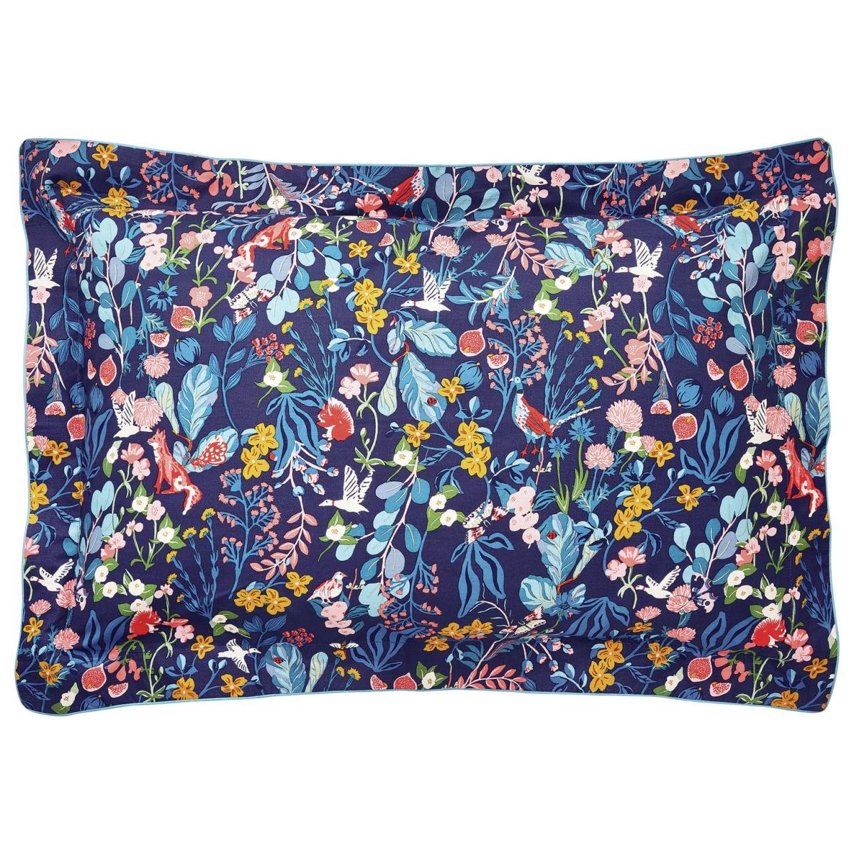 From squirrels and foxes to birds and butterflies, this bedding set brings together the best of the British woodland in one beautifully hand-drawn ditsy print. You'll be forever finding new things hidden amongst the whimsical print while the bold colours will brighten even the greyest of days. The animal adventures continue the reverse, set against a contrasting white background while the edges are finished with blue cord piping. The set comes with a duvet cover and two matching Oxford pillowcases (single sets come with one) with complementing standard pillowcases available separately. We are pleased to tell you that this product is made using sustainably sourced cotton. All over woodland animal ditsy print on a navy ground to the front and the same on the reverse but on grey ground. Finish: percale. 100% cotton. 180 thread count. Set includes 1 duvet cover and 1 pillowcase. Bed size: single. Length 200cm, Width 135cm. Piped edging detail. Reversible. Buttons for fastening. Oxford pillowcase (s). Pillow case length 75cm, Width 50cm. Machine washable. Suitable for tumble drying.