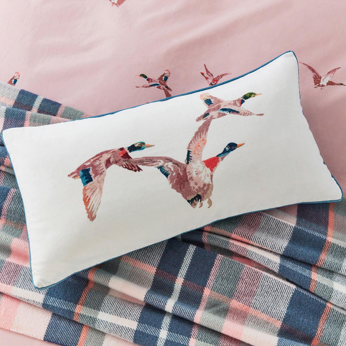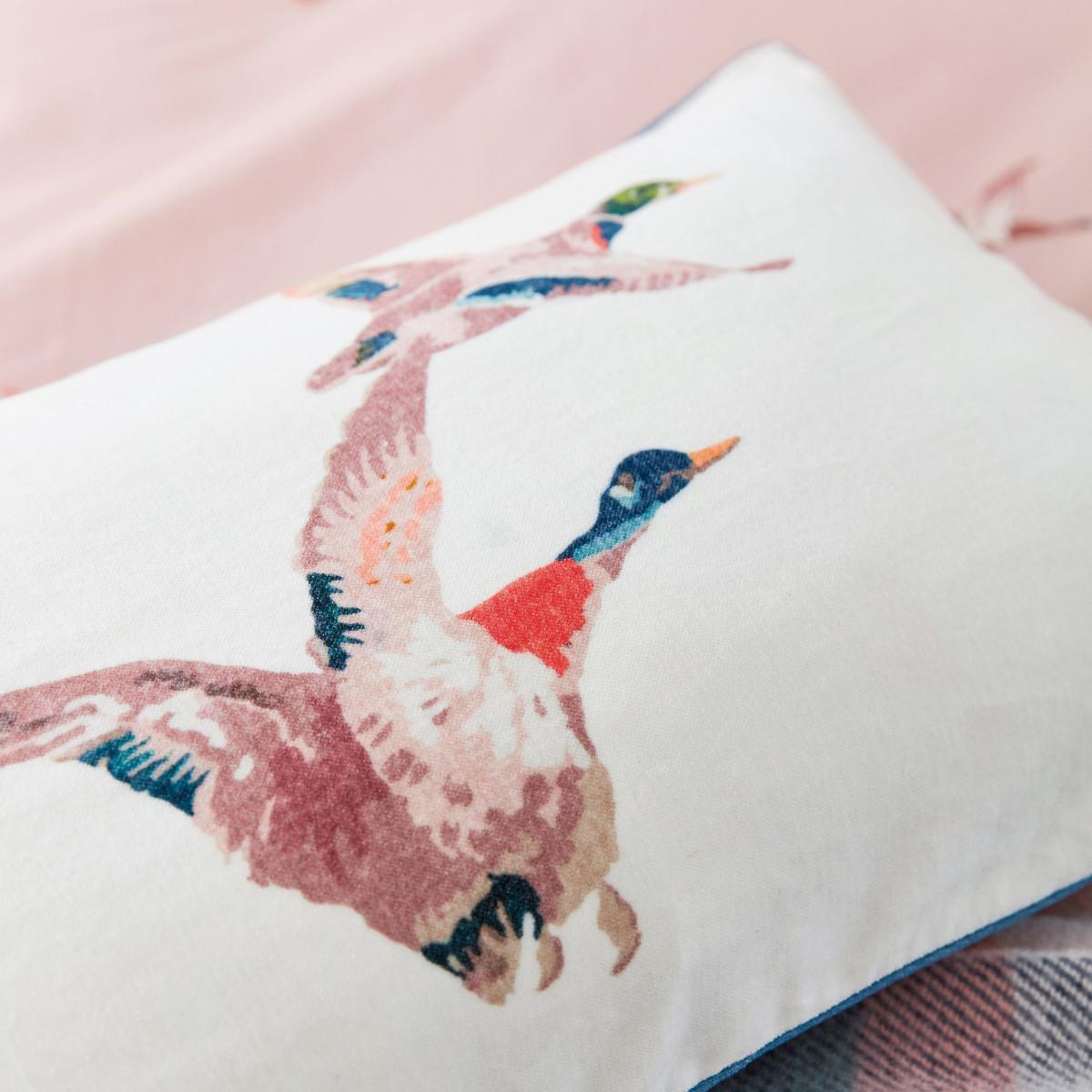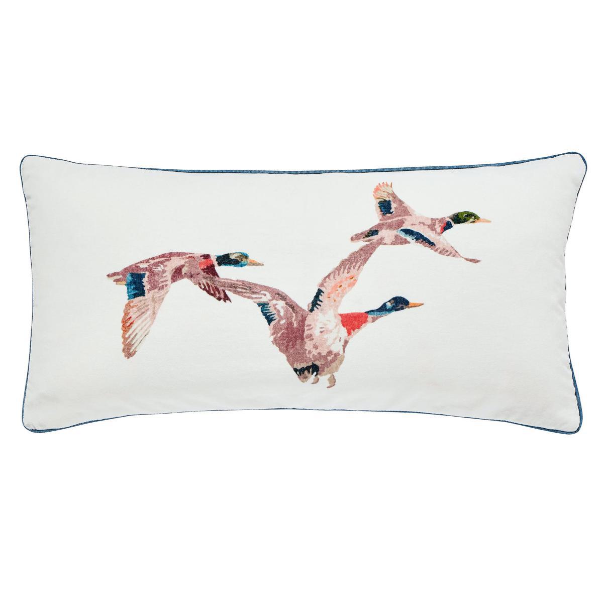 I love this cushion for its playful yet stylish design, perfect for adding a touch of nature-inspired charm to various interiors. Its white base with red, blue, and green flying mallards works especially well in country cottage, nautical, or eclectic schemes, bringing a lively pop of colour without overwhelming the space. For practical styling tips, try pairing it with plain, textured throws or soft linens in complementary colours like navy or soft pink to create a balanced look. It also works great layered with other cushions in mixed patterns or neutral tones for a cosy, inviting feel. This cushion can easily lift a sofa or bed and adds a hint of outdoor whimsy with its bird motif.
