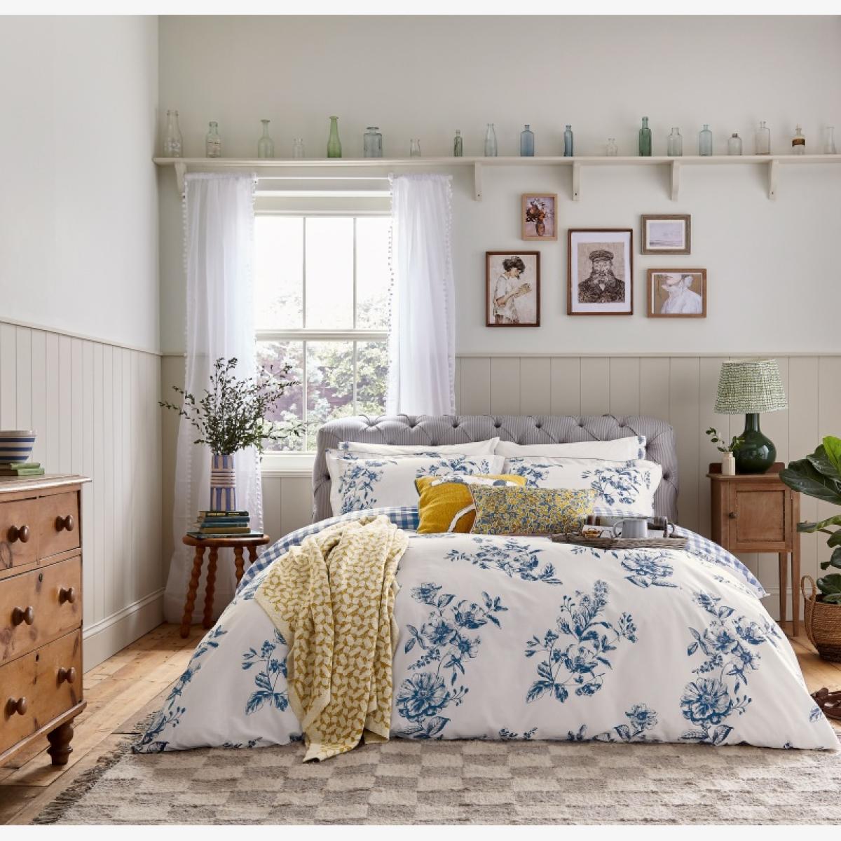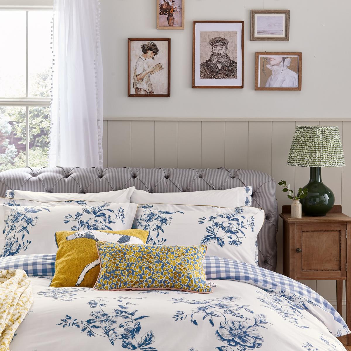 Achieving timeless country cottage style is a breeze with our Honey Floral Bedding Set. Beautiful blooms have been etched in navy upon a fresh, cream background, inspired by botanical sketches you might find in the old encyclopedia on your bookshelf. Look carefully and you'll spot a busy bee pollinating the flowers. The reverse is a classic gingham check in tonal navy and blue shades. This set comes with two matching Oxford pillowcases with antique gold piping (single beds come with one) and can be complemented by additional standard pillowcases sold separately. Features 100% Cotton Reversible 180 Thread count Button fastening Single duvet includes a single pillowcase Double, king and superking duvet includes a pair of pillowcases Care Instructions Machine washable Tumble dry Please note All screens vary in colour reproduction and whilst every effort has been made to display the colour as accurately as possible it is for guidance only.