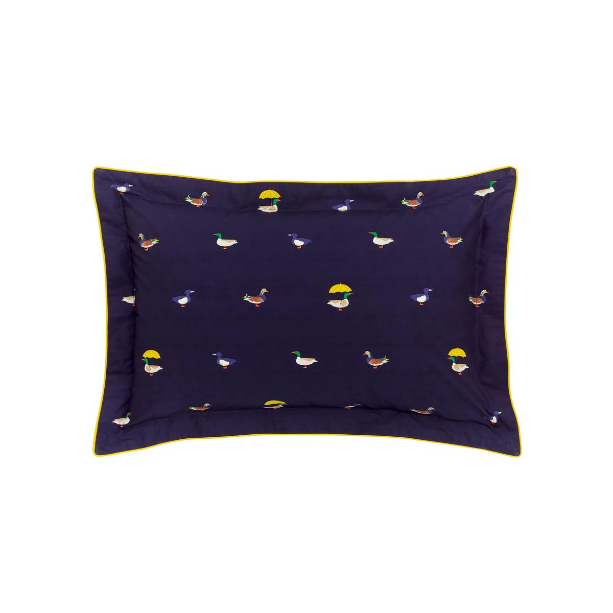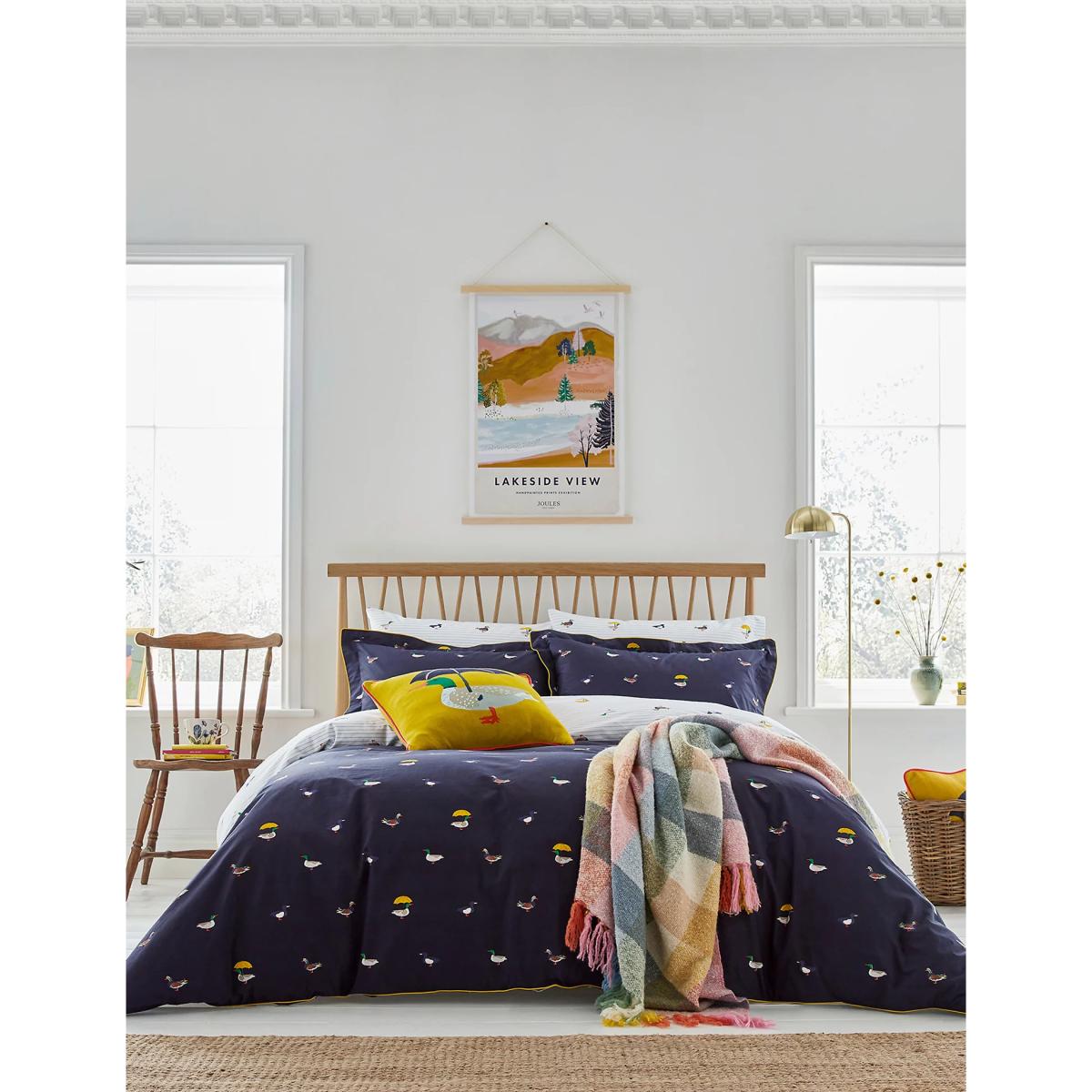Bring the outdoors in with this quirky bedding set from Joules. Featuring a selection of hand-drawn ducks, some holding a sunshine yellow brolly, this is a set that will have you starting the day with a smile. The print sits against a solid navy background. The set is made from 180 thread count pure cotton percale and includes two Oxford pillowcases. One side is plain and the reverse is striped, both featuring an all-over duck print. Each piece is finished with sophisticated piping around the edges.