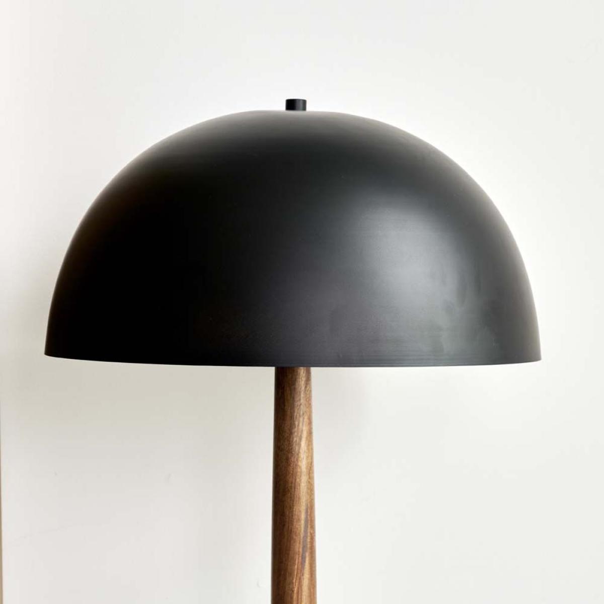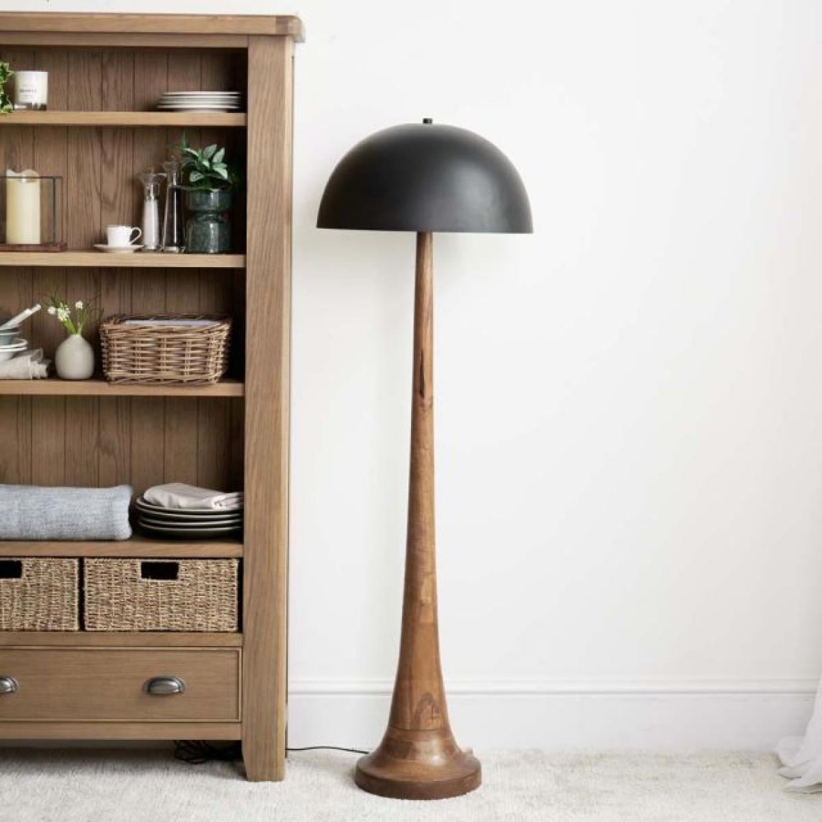 The Jovany Floor Lamp is a stylish and unique design with a sweeping stem made from tropical wood in a dark stain and topped with a dome shaped shade made from black powder coated steel. This lamp comes in three sizes and is super easy to assemble. Make a statement in your home with the Jovany floor lamp.