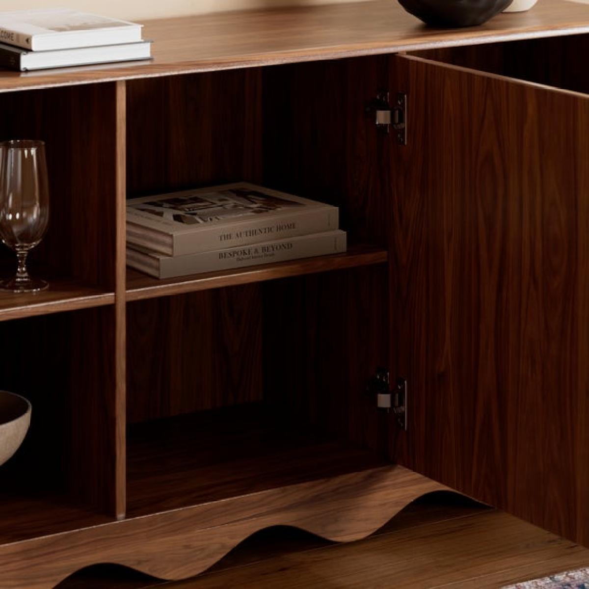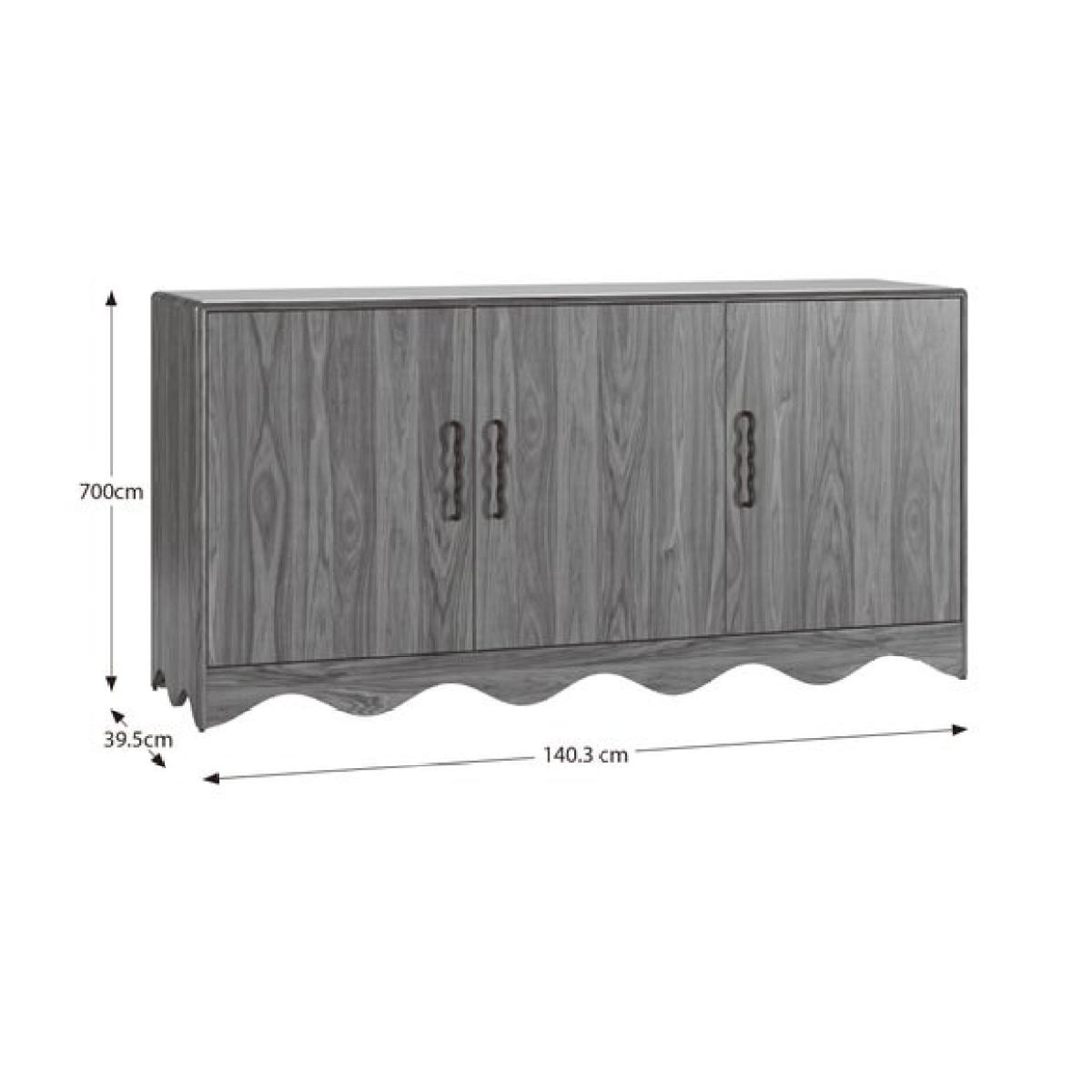 * Modern sideboard * Wiggle design * Unique handles Transform your space with the Jovie Sideboard, a bold and contemporary storage solution that doesn’t shy away from making a statement. The unique wiggle design adds a playful twist to traditional cabinetry, while the walnut effect finish brings warmth and texture to your room. A standout black feature handle adds a modern edge, making this sideboard as stylish as it is functional. With ample storage behind its doors, it’s perfect for keeping your home organised, whether in the dining room, lounge, or hallway