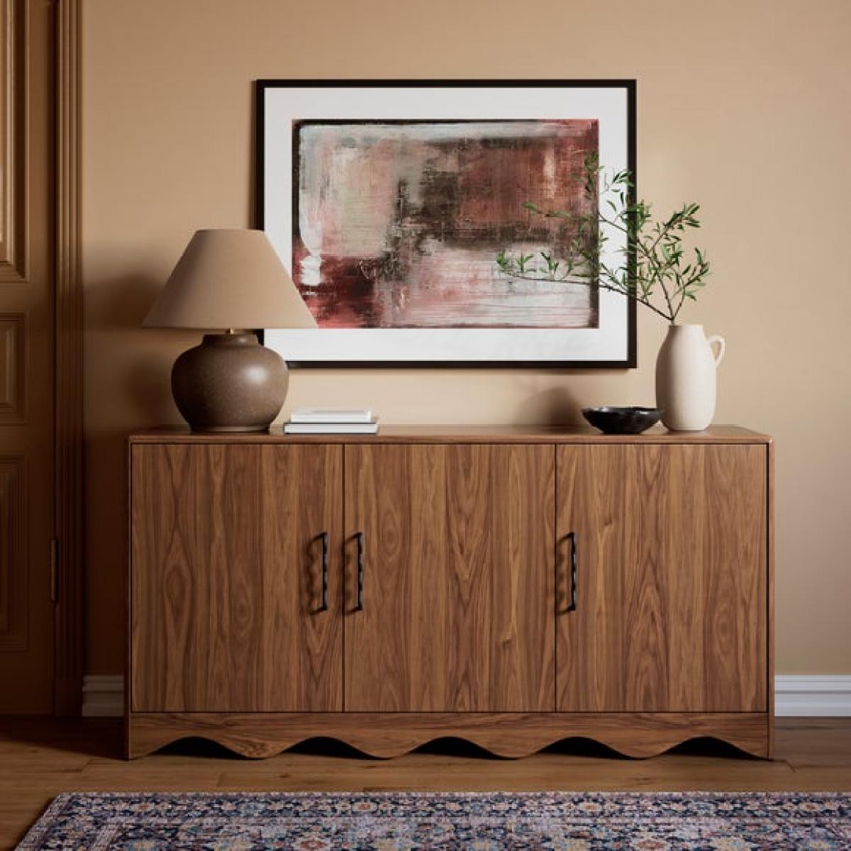 I love the Jovie sideboard for its clean lines and warm, natural wood finish, which makes it a versatile piece that can complement a variety of interiors. It works particularly well in mid-century modern, Scandi, or even more traditional settings when styled thoughtfully. Practical styling tips include keeping the surface relatively clutter-free by showcasing a few statement vases, lamps, or artwork, like the picture above. Its ample storage makes it ideal for hiding away items in a living room or dining area, keeping the space looking organised and tidy. Pairing it with patterned rugs or textured cushions can help soften the look, making it both functional and inviting.