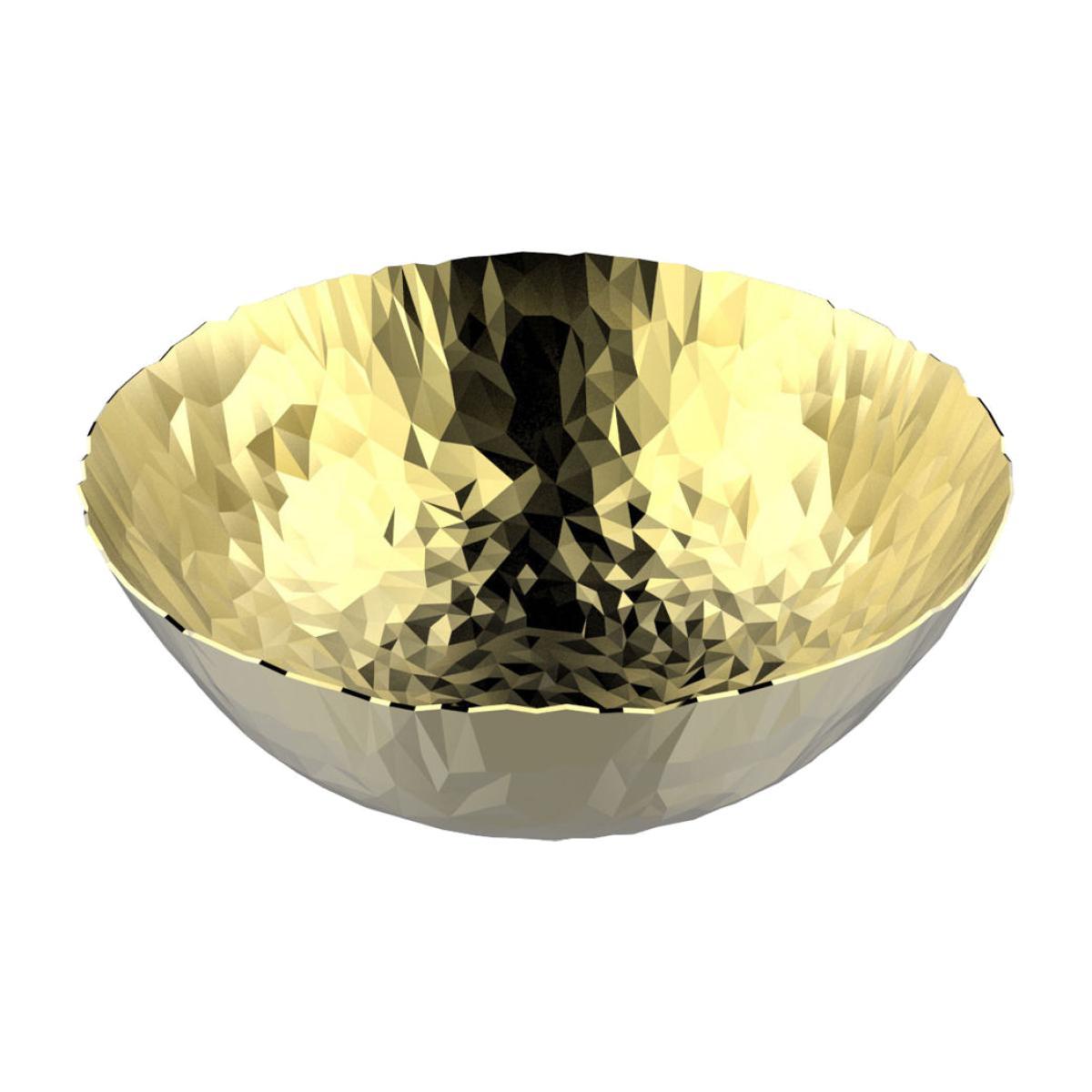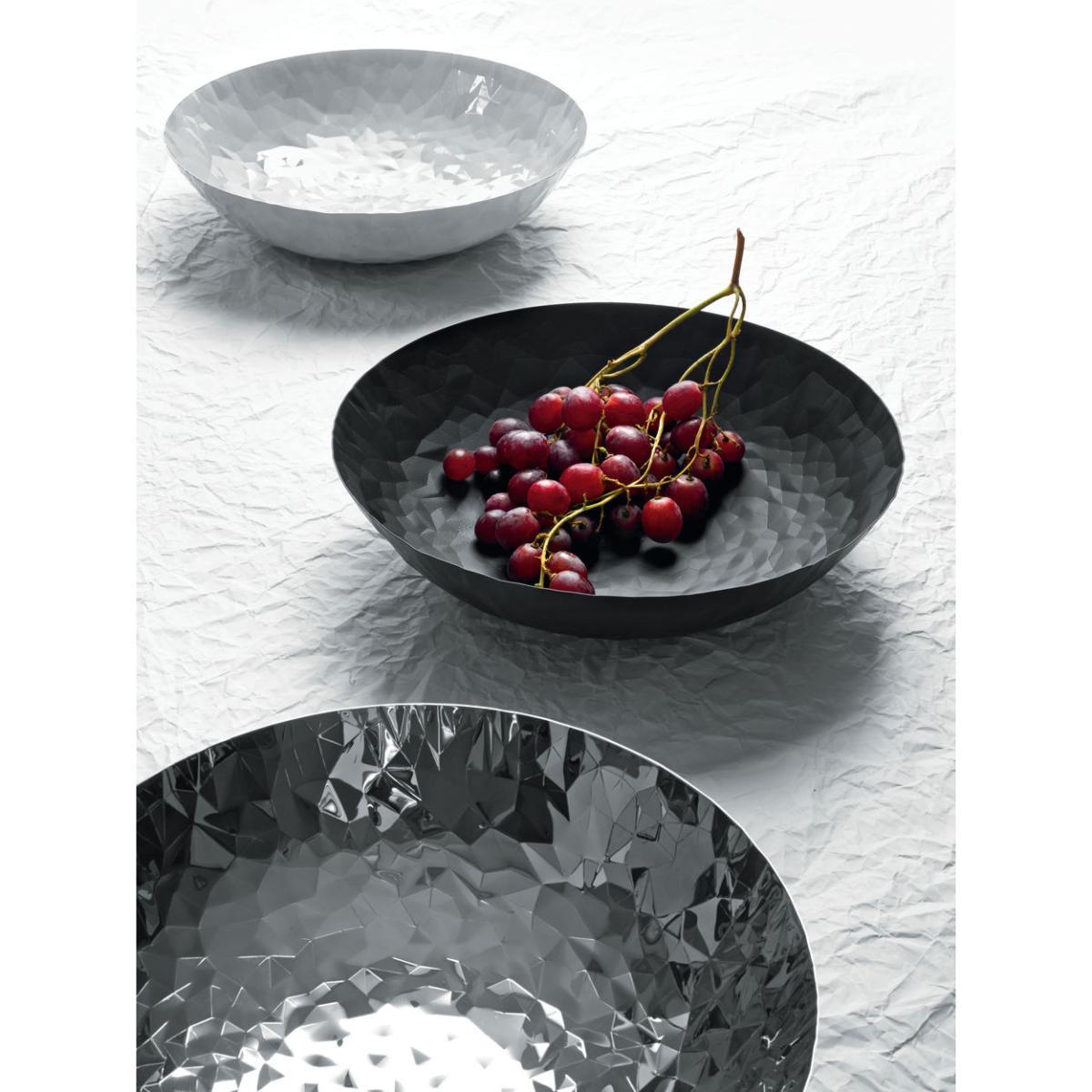 A sheet of steel becomes form and decoration: Joy, like a jewel, a pleasure. Alessi Joy in 18/10 steel. The designer has designed a piece with embossed sides and an uneven, jagged rim. The irregular texture creates a fascinating play of light that enhances the object, invoking the image of master silversmiths' machined surfaces.