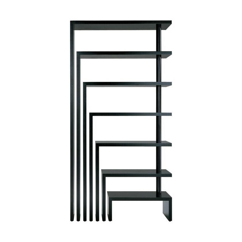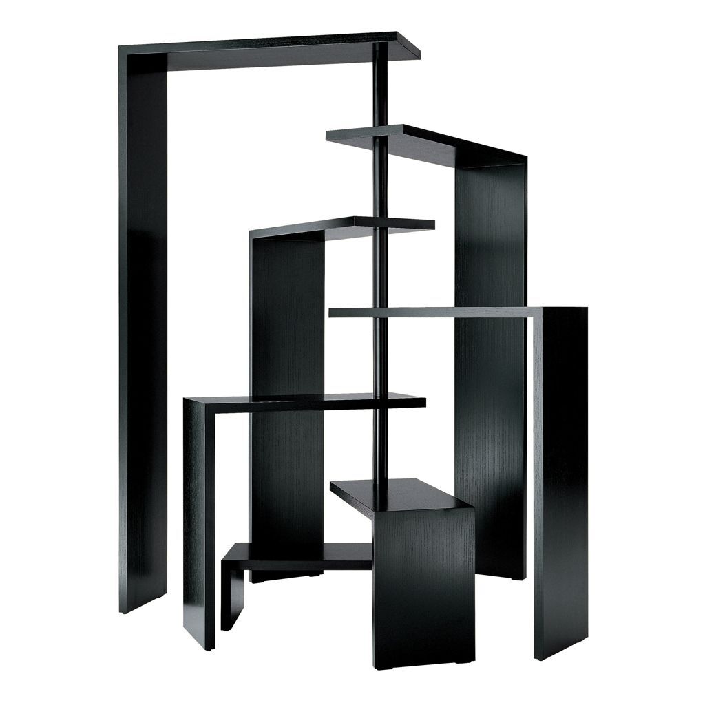 Designed in 1989 by Achille Castiglioni, the Joy Rotating Shelving Unit in black is a dynamic storage unit that offers seven versatile shelves that can be adapted to create a unique display. Pivoting from a black steel articulated joint, the Achille Castiglioni Joy Shelving Unit allows each of its seven shelves to rotate around its stem to create a sweeping silhouette and personalised formation. The Joy Rotating Shelving Unit showcases a scratch-resistant black body, which ensures a resilient surface and striking aesthetic. Manufactured by Italian leaders in industrial design, Zanotta, the Joy Rotating Shelving Unit in black would make a distinctive addition to any living space.