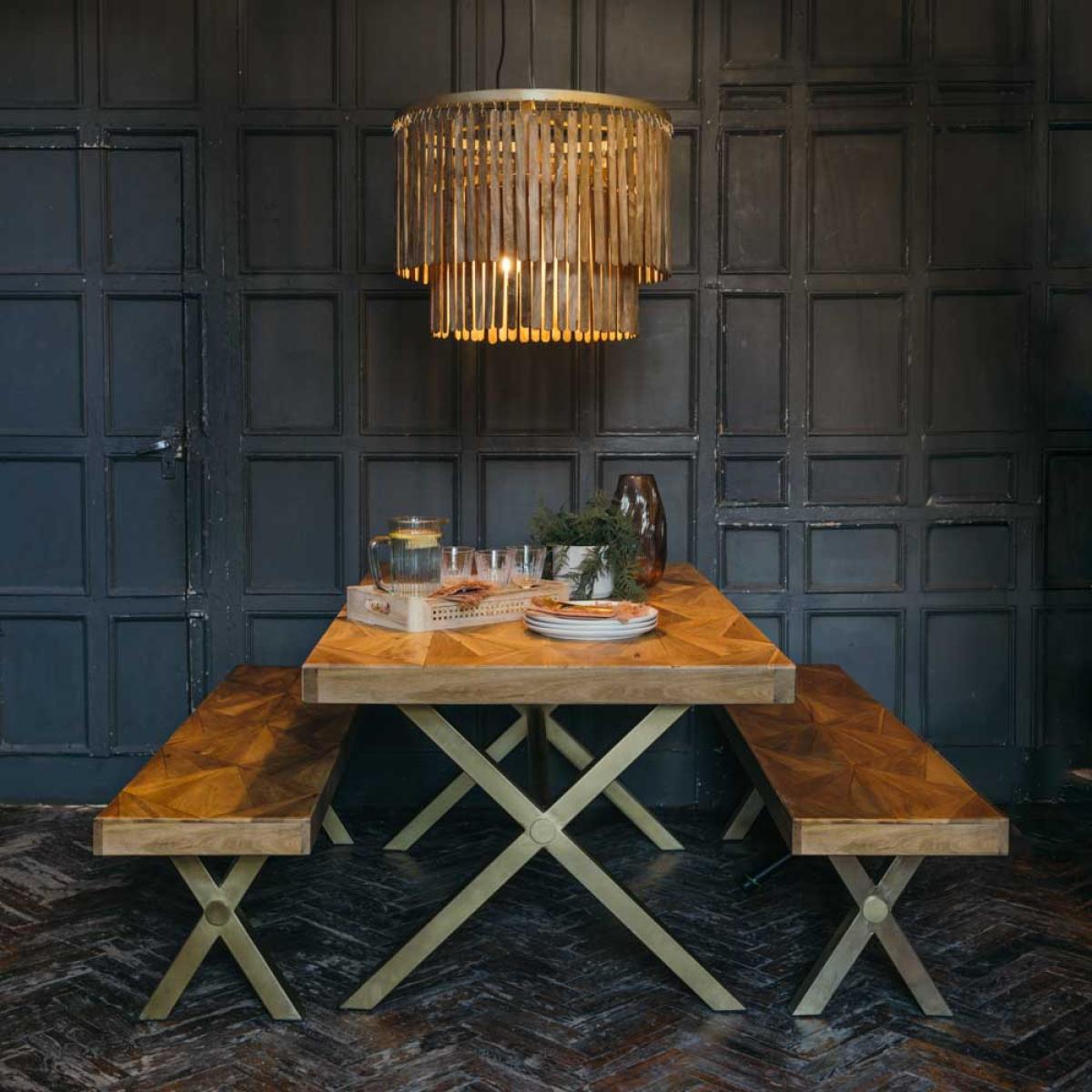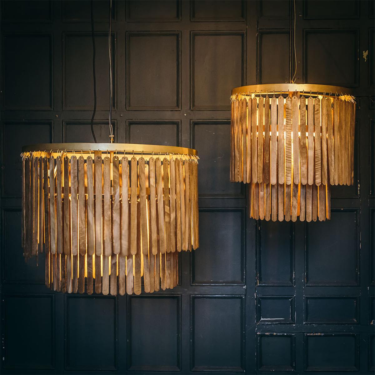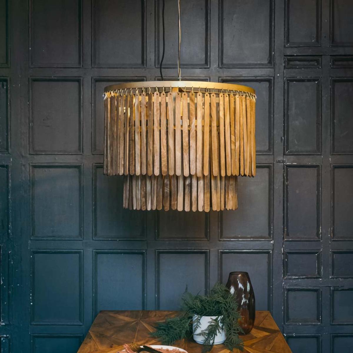 Ceiling lights can create instant impact and a statement look in any space. Our Joya Pendant Light in a Dark Brown wood finish is a striking chandelier inspired by boho chic. Featuring solid wooden strips suspended on a luxurious brass metal frame, this glamorous pendant lighting is perfect for hanging over a round or rectangular shaped dining table, banquette or dining booth. Combining easy living with a statement look and premium quality design, Joya draws inspiration from beachside living in the Mediterranean. The beachcomber effect is ideal for all interior décors and rooms including living, dining, kitchens and bedrooms. Modern lighting at its very best, hanging lights are a flexible solution that will create instant impact and to complete the look, use a globe opal bulb for a soft, intimate pool of light. The Joya Pendant Light is available in large (W60x D60x H43 cm) or medium (W45x D45x H43 cm).