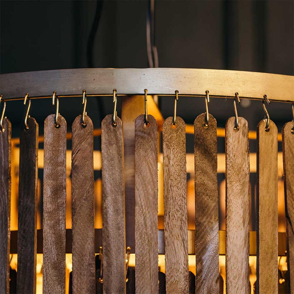Ceiling lights can create instant impact and a statement look in any space. Our Joya Pendant Light in a Dark Brown wood finish is a striking chandelier inspired by boho chic. Featuring solid wooden strips suspended on a luxurious brass metal frame, this glamorous pendant lighting is perfect for hanging over a round or rectangular shaped dining table, banquette or dining booth. Combining easy living with a statement look and premium quality design, Joya draws inspiration from beachside living in the Mediterranean. The beachcomber effect is ideal for all interior décors and rooms including living, dining, kitchens and bedrooms. Modern lighting at its very best, hanging lights are a flexible solution that will create instant impact and to complete the look, use a globe opal bulb for a soft, intimate pool of light. The Joya Pendant Light is available in medium (W45x D45x H43 cm) or large (W60x D60x H43 cm).
